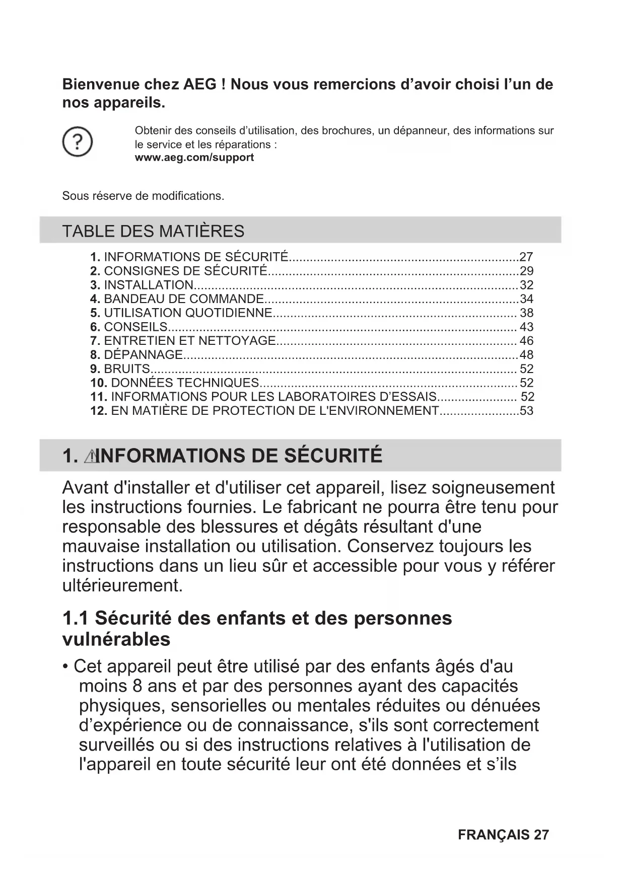 Recyclez les matériaux portant le symbole . Déposez les emballages dans les conteneurs prévus à cet effet. Contribuez à la protection de l'environnement et à votre sécurité, recyclez vos produits électriques et électroniques. Ne jetez pas les appareils portant le symbole avec les ordures ménagères. Emmenez un tel produit dans votre centre local de recyclage ou contactez vos services municipaux. FRANÇAIS 53Willkommen bei AEG! Danke, dass Sie sich für unser Gerät entschieden haben. Um Anwendungshinweise, Prospekte, Informationen zu Fehlerbehebung, Service undReparatur zu erhalten:www.aeg.com/supportÄnderungen vorbehalten. INHALTSVERZEICHNIS
