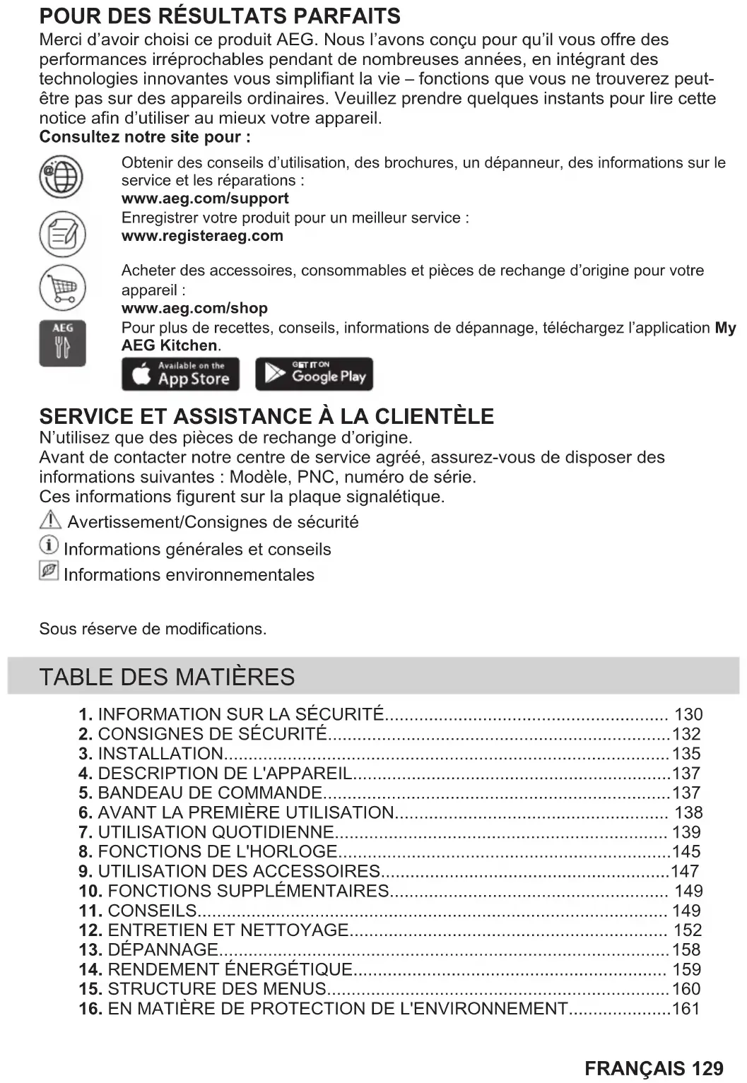 Merci d’avoir choisi ce produit AEG. Nous l’avons conçu pour qu’il vous offre des performances irréprochables pendant de nombreuses années, en intégrant des technologies innovantes vous simplifiant la vie – fonctions que vous ne trouverez peut- être pas sur des appareils ordinaires. Veuillez prendre quelques instants pour lire cette notice afin d’utiliser au mieux votre appareil. Consultez notre site pour : Obtenir des conseils d’utilisation, des brochures, un dépanneur, des informations sur leservice et les réparations :www.aeg.com/supportEnregistrer votre produit pour un meilleur service :www.registeraeg.comAcheter des accessoires, consommables et pièces de rechange d’origine pour votreappareil :www.aeg.com/shopPour plus de recettes, conseils, informations de dépannage, téléchargez l’application MyAEG Kitchen.