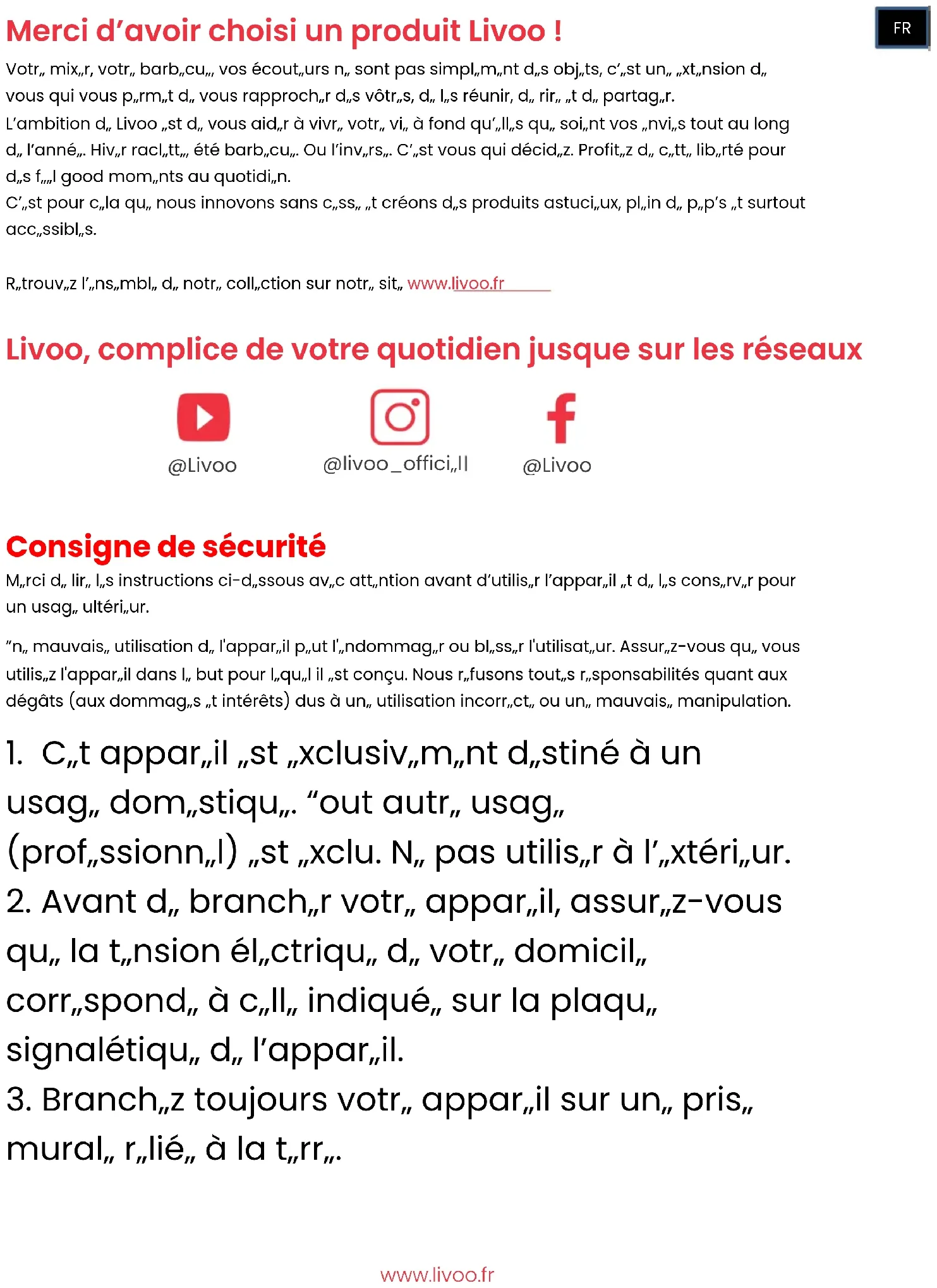 Figure 1www.livoo.fr Merci d’avoir choisi un produit Livoo ! Votre mixer, votre barbecue, vos écouteurs ne sont pas simplement des objets, c’est une extension de vous qui vous permet de vous rapprocher des vôtres, de les réunir, de rire et de partager. L’ambition de Livoo est de vous aider à vivre votre vie à fond qu’elles que soient vos envies tout au long de l’année. Hiver raclette, été barbecue. Ou l’inverse. C’est vous qui décidez. Profitez de cette liberté pour des feel good moments au quotidien. C’est pour cela que nous innovons sans cesse et créons des produits astucieux, plein de pep’s et surtout accessibles. Retrouvez l’ensemble de notre collection sur notre site www.livoo.fr Livoo, complice de votre quotidien jusque sur les réseaux