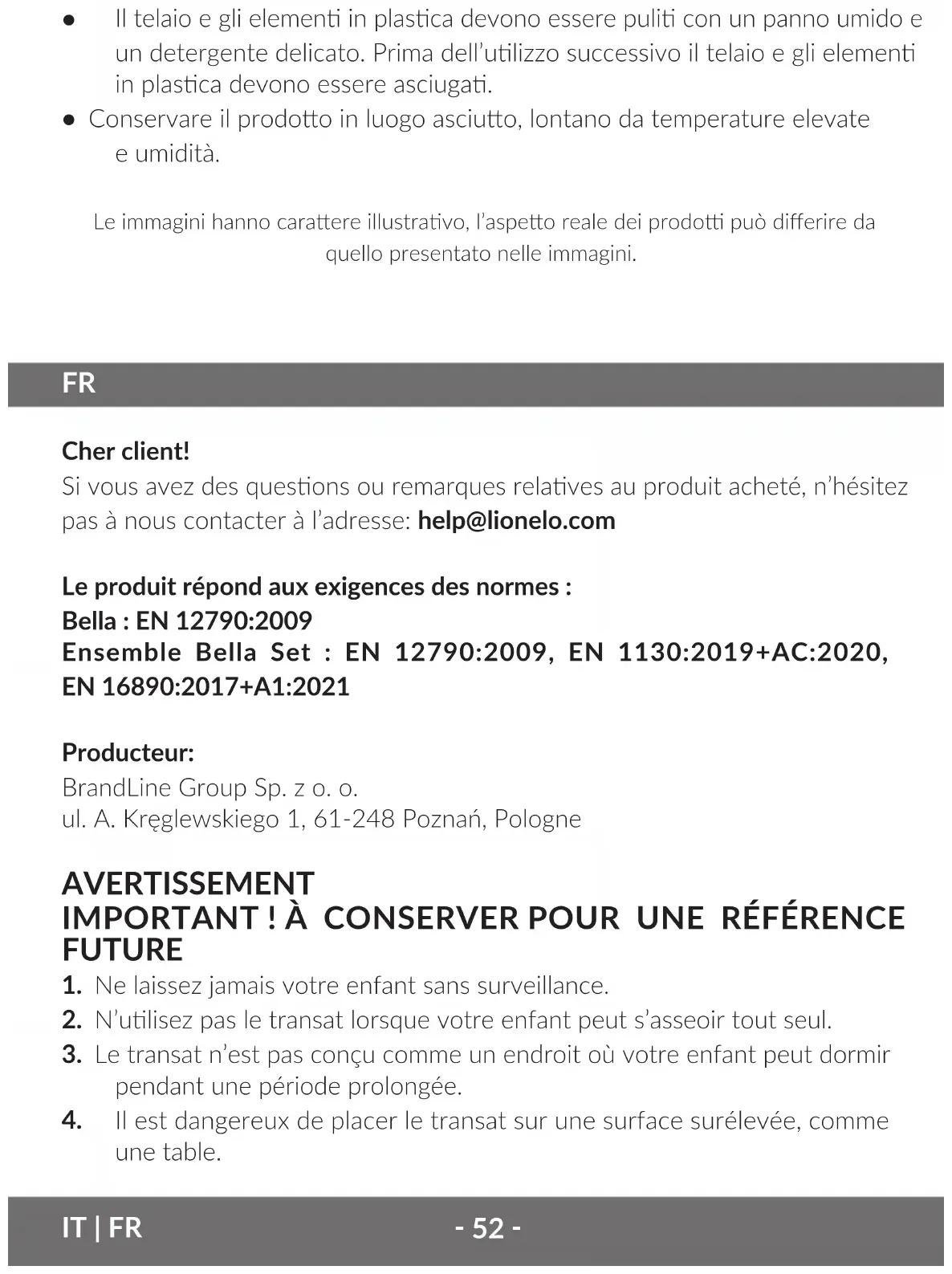 Cher client! Si vous avez des quesons ou remarques relaves au produit acheté, n’hésitez pas à nous contacter à l’adresse: help@lionelo.com Le produit répond aux exigences des normes : Bella : EN 12790:2009 Ensemble Bella Set : EN 12790:2009, EN 1130:2019+AC:2020, EN 16890:2017+A1:2021 Producteur: BrandLine Group Sp. z o. o. ul. A. Kręglewskiego 1, 61-248 Poznań, Pologne AVERTISSEMENT IMPORTANT ! À CONSERVER POUR UNE RÉFÉRENCE FUTURE