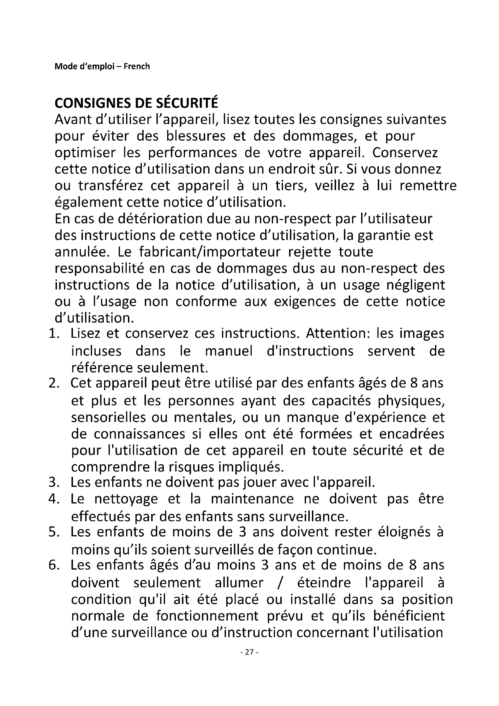 Avant d’utiliser l’appareil, lisez toutes les consignes suivantes pour éviter des blessures et des dommages, et pour optimiser les performances de votre appareil. Conservez cette notice d’utilisation dans un endroit sûr. Si vous donnez ou transférez cet appareil à un tiers, veillez à lui remettre également cette notice d’utilisation. En cas de détérioration due au non-respect par l’utilisateur des instructions de cette notice d’utilisation, la garantie est annulée. Le fabricant/importateur rejette toute responsabilité en cas de dommages dus au non-respect des instructions de la notice d’utilisation, à un usage négligent ou à l’usage non conforme aux exigences de cette notice d’utilisation.