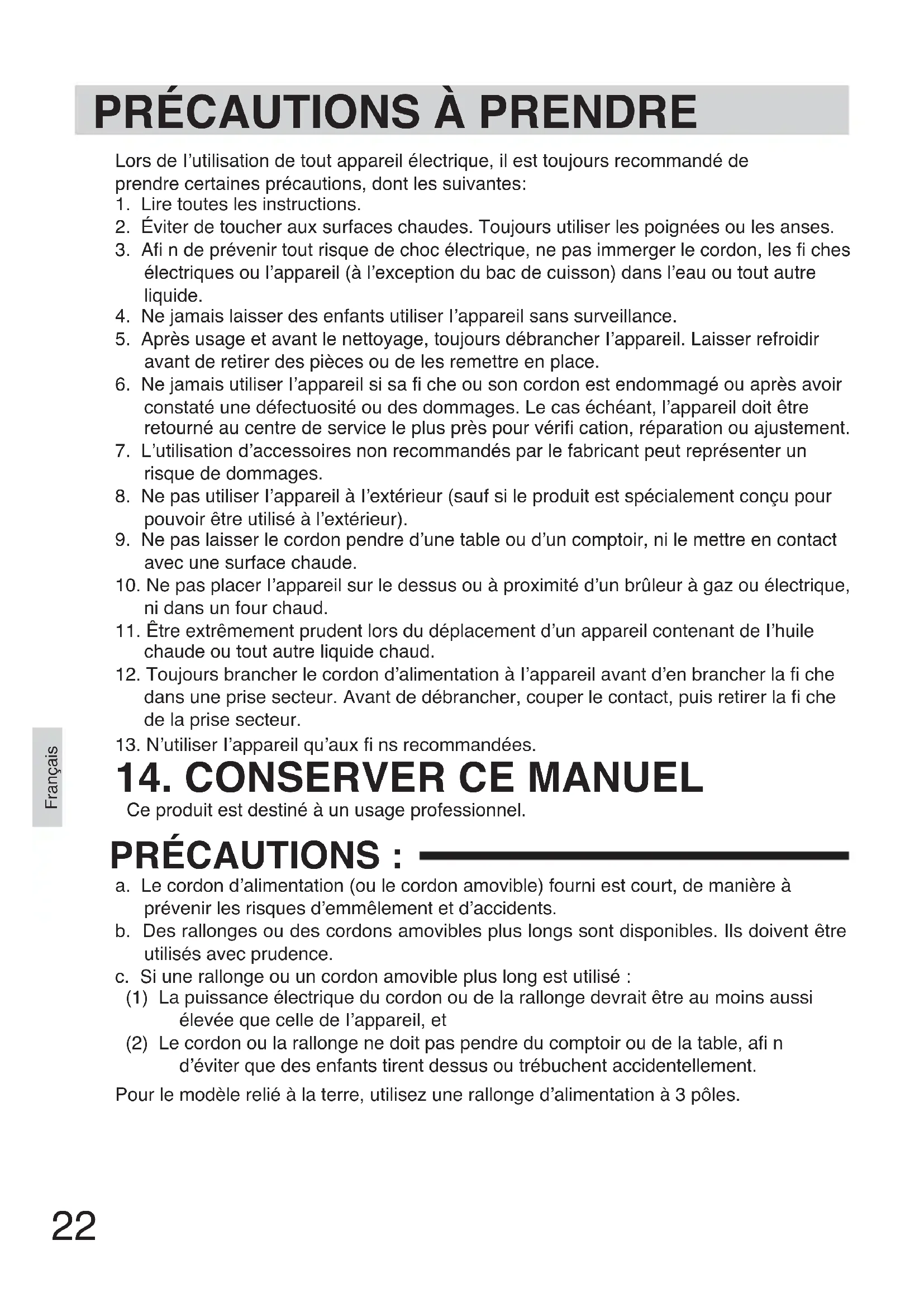 8. Ne pas utiliser I’appareil à I’extérieur (sauf si le produit est spécialement conçu pour