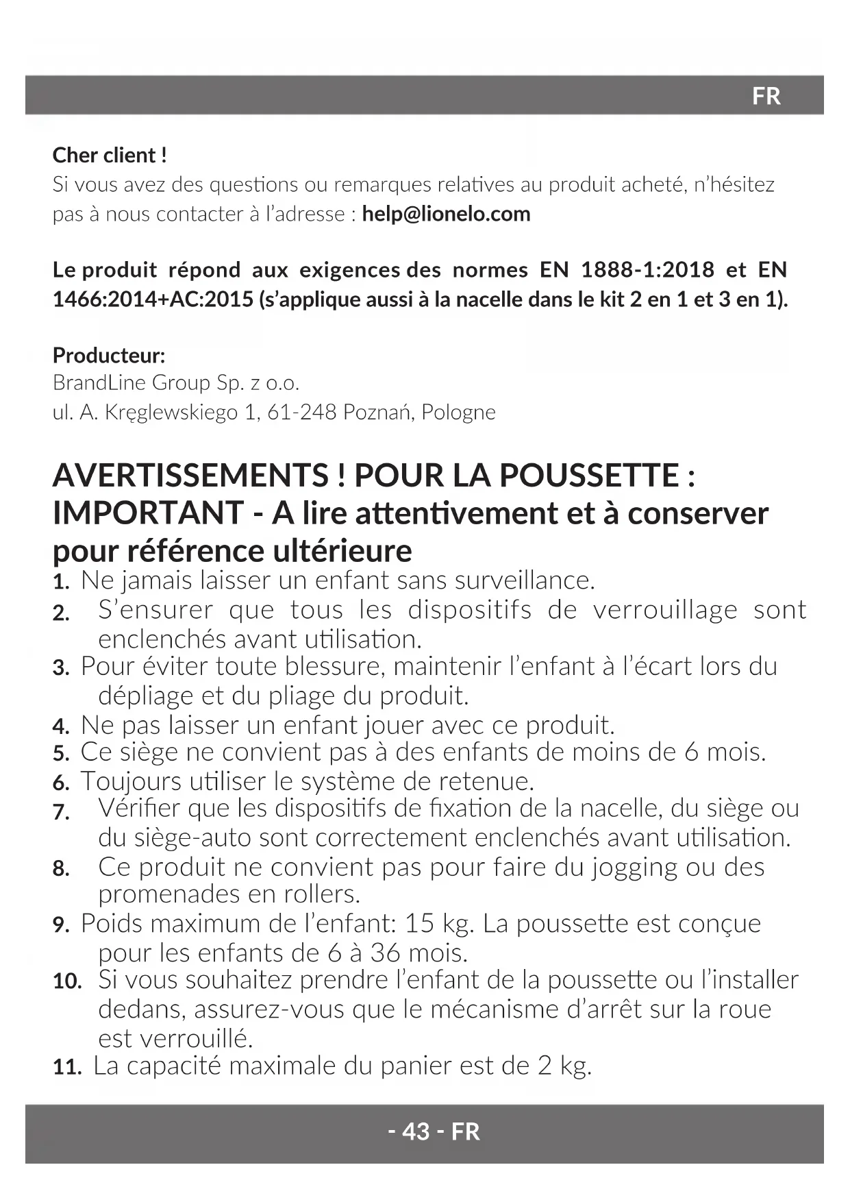 Cher client ! Si vous avez des quesons ou remarques relaves au produit acheté, n’hésitez pas à nous contacter à l’adresse : help@lionelo.com Le produit répond aux exigences des normes EN 1888-1:2018 et EN 1466:2014+AC:2015 (s’applique aussi à la nacelle dans le kit 2 en 1 et 3 en 1). Producteur: BrandLine Group Sp. z o.o. ul. A. Kręglewskiego 1, 61-248 Poznań, Pologne AVERTISSEMENTS ! POUR LA POUSSETTE : IMPORTANT - A lire aenvement et à conserver pour référence ultérieure