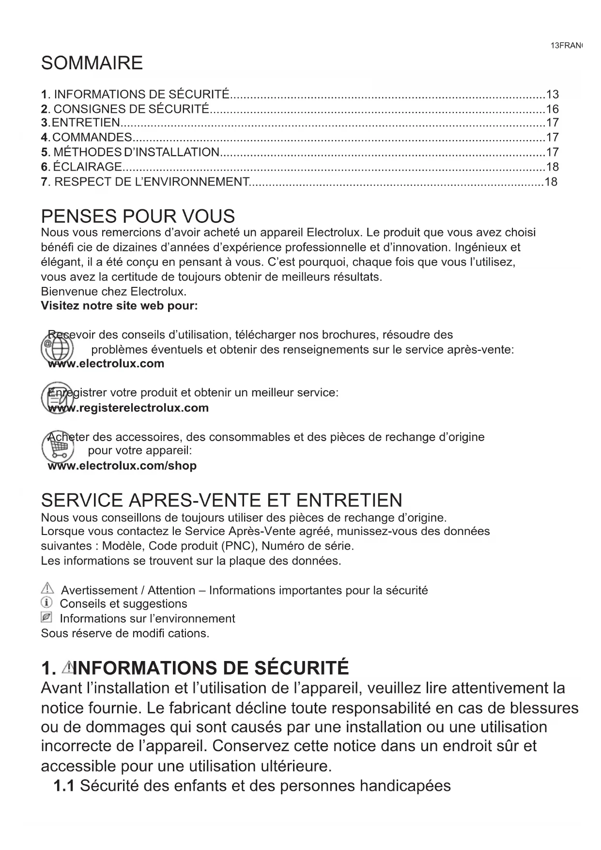 Nous vous remercions d’avoir acheté un appareil Electrolux. Le produit que vous avez choisi bénéfi cie de dizaines d’années d’expérience professionnelle et d’innovation. Ingénieux et élégant, il a été conçu en pensant à vous. C’est pourquoi, chaque fois que vous l’utilisez, vous avez la certitude de toujours obtenir de meilleurs résultats. Bienvenue chez Electrolux. Visitez notre site web pour: Recevoir des conseils d’utilisation, télécharger nos brochures, résoudre des problèmes éventuels et obtenir des renseignements sur le service après-vente: www.electrolux.com Enregistrer votre produit et obtenir un meilleur service: www.registerelectrolux.com Acheter des accessoires, des consommables et des pièces de rechange d’origine pour votre appareil: www.electrolux.com/shop