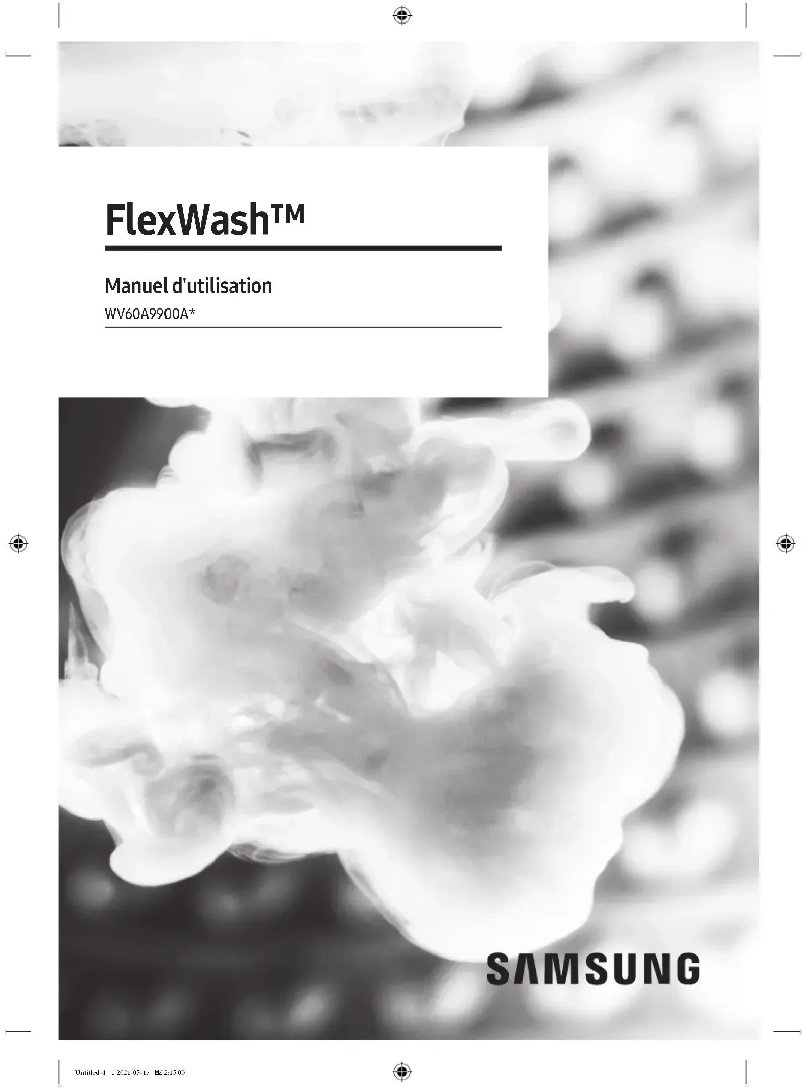 Visits by a Service Engineer to explain functions, maintenance, or installation are not covered by warranty. Please contact the Samsung call center for help with any of these issues. Untitled-2 85 2021-05-17 2:04:43Memo Untitled-2 86 2021-05-17 2:04:43Memo Untitled-2 87 2021-05-17 2:04:43Scan this with your smartphone QUESTIONS OR COMMENTS? COUNTRY CALL OR VISIT US ONLINE AT U.S.A 1-800-SAMSUNG (726-7864) www.samsung.com/us/support CANADA 1-800-SAMSUNG(726-7864) www.samsung.com/ca/support (English) www.samsung.com/ca_fr/support (French) DC68-04316A-00 Untitled-2 88 2021-05-17 2:04:44FlexWash™ Manuel d'utilisation WV60A9900A* Untitled-4 1 2021-05-17 2:15:00Français Français2 Sommaire Consignes de sécurité 4 Remarques importantes sur les consignes de sécurité 4 Symboles de sécurité importants 4 Consignes de sécurité importantes 5 AVERTISSEMENT CONCERNANT LA PROPOSITION 65 DE L'ÉTAT DE CALIFORNIE 5 Avertissements importants concernant l'installation 6 Mises en garde pour l'installation 7 Avertissements importants concernant l'utilisation 8 Mises en garde concernant l'utilisation 9 Avertissements importants concernant le nettoyage 12 Notication de réglementation 13 Avis concernant la FCC 13 Notication IC 14 Annonce de logiciel open source 15 Installation 16 Déballage de votre lave-linge 16 Ce qui est inclus 17 Conditions d'installation 19 Installation étape par étape 23 Avant de commencer 32 Conguration initiale 32 Instructions de lavage 33 Guide des produits de nettoyage 36 Cycles 41 Panneau de commande 41 Utilisation d'un cycle 44 Présentation des cycles 46 Tableau des cycles 49 Options 52 Fonctions système 55 Fonctions spéciales 57 SmartThings 58 Untitled-4 2 2021-05-17 2:15:00Français Français 3 Entretien 60 Considérations générales 60 Partie supérieure du lave-linge 63 Partie inférieure du lave-linge 66 Dépannage 72 Contrôles à effectuer 72 Codes d'information 77 Caractéristiques techniques 80 Tableau des symboles textiles 80 Protection de l'environnement 81 Déclaration de conformité 81 Fiche de caractéristiques techniques 82 Untitled-4 3 2021-05-17 2:15:00Français