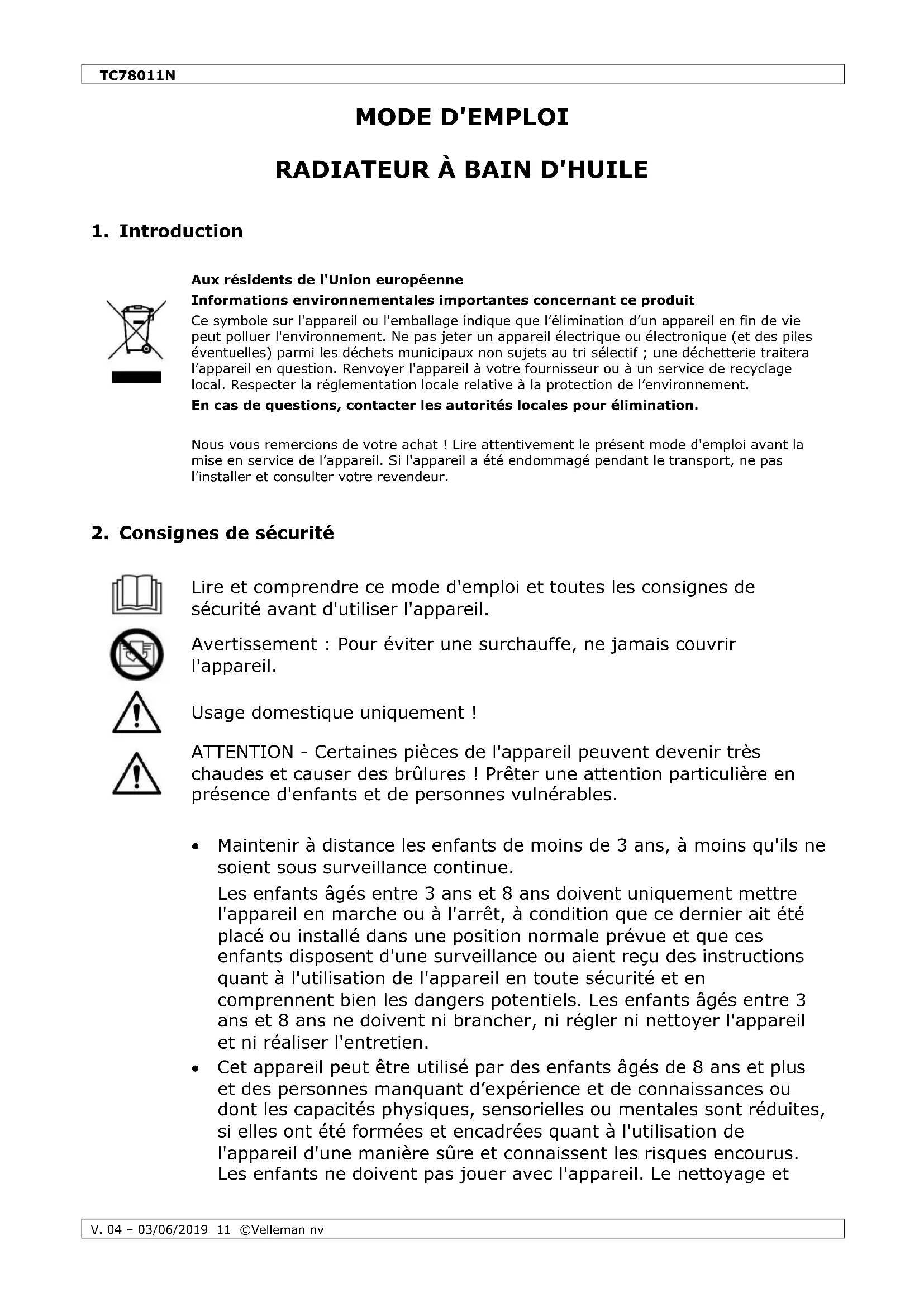 Velleman SA est l’ayant droit des droits d’auteur de ce mode d'emploi. Tous droits mondiaux réservés. Toute reproduction, traduction, copie ou diffusion, intégrale ou partielle, du contenu de ce mode d'emploi par quelque procédé ou sur tout support électronique que ce soit est interdite sans l’accord préalable écrit de l’ayant droit.TC78011N