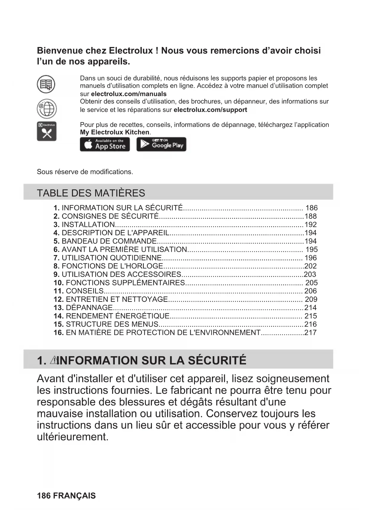 Avant d'installer et d'utiliser cet appareil, lisez soigneusement les instructions fournies. Le fabricant ne pourra être tenu pour responsable des blessures et dégâts résultant d'une mauvaise installation ou utilisation. Conservez toujours les instructions dans un lieu sûr et accessible pour vous y référer ultérieurement. 186 FRANÇAIS1.1 Sécurité des enfants et des personnes vulnérables
