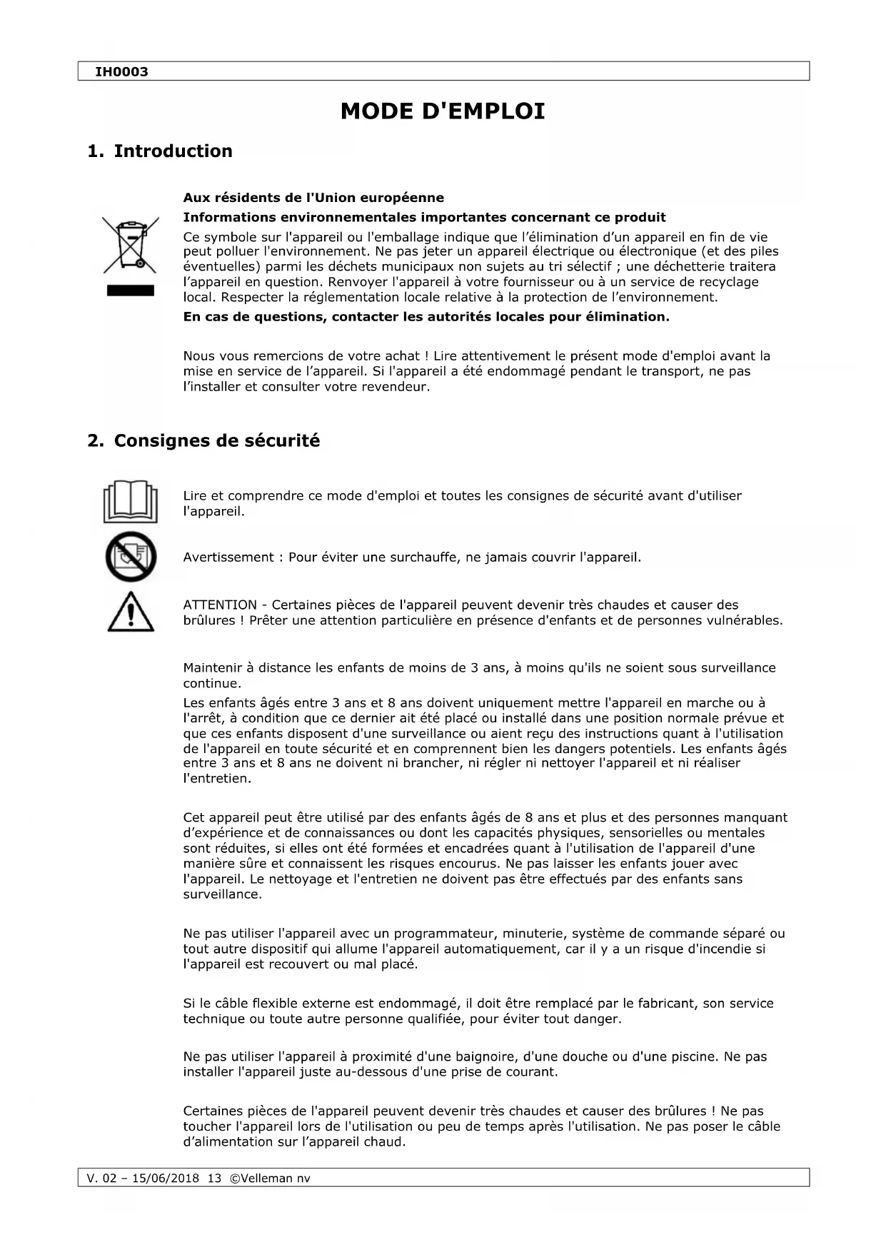 Velleman SA est l’ayant droit des droits d’auteur de ce mode d'emploi. Tous droits mondiaux réservés. Toute reproduction, traduction, copie ou diffusion, intégrale ou partielle, du contenu de ce mode d'emploi par quelque procédé ou sur tout support électronique que ce soit est interdite sans l’accord préalable écrit de l’ayant droit.IH0003