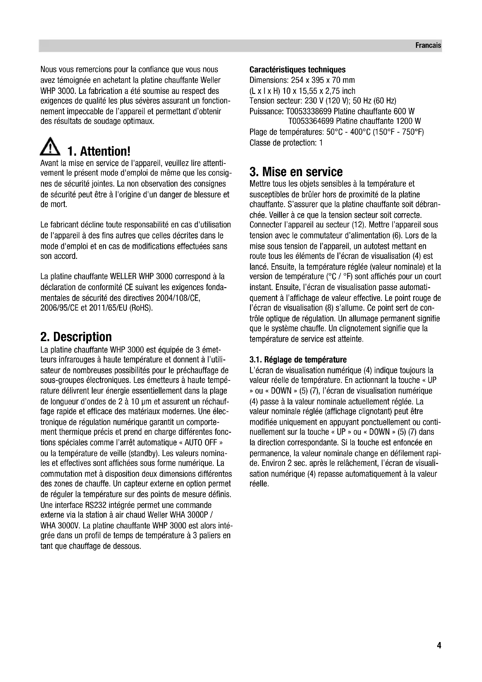 Avant la mise en service de l'appareil, veuillez lire attenti- vement le présent mode d'emploi de même que les consig- nes de sécurité jointes. La non observation des consignes de sécurité peut être à l'origine d'un danger de blessure et de mort. Le fabricant décline toute responsabilité en cas d'utilisation de l'appareil à des fins autres que celles décrites dans le mode d'emploi et en cas de modifications effectuées sans son accord. La platine chauffante WELLER WHP 3000 correspond à la déclaration de conformité CE suivant les exigences fonda- mentales de sécurité des directives 2004/108/CE, 2006/95/CE et 2011/65/EU (RoHS).