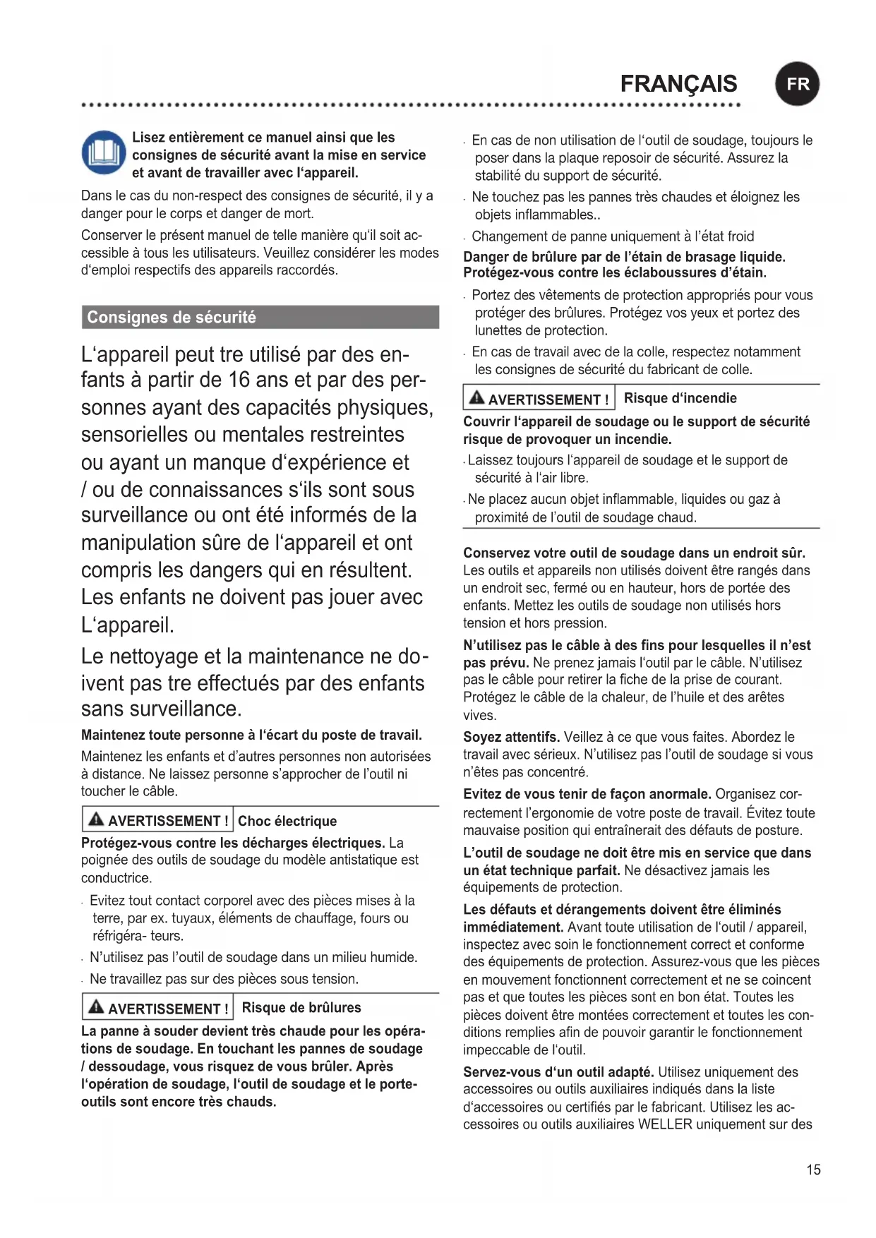 FRANÇAIS16 appareils WELLER d‘origine. L‘utilisation d‘autres outils ou accessoires peut entraîner un risque de blessure. Fixez l‘outil. Utilisez des dispositifs de xation pour maintenir l‘outil. Prévoyez une aspiration des fumées. Si un dispositif a été prévu pour le branchement d‘aspirations des fumées, veillez à ce qu‘il soit branché et correctement utilisé. Soudage Veuillez lire et respecter le mode d‘emploi de l‘unité d‘alimentation Weller utilisée. N‘utiliser que des pannes à souder originales WELLER ! Traitement des pannes