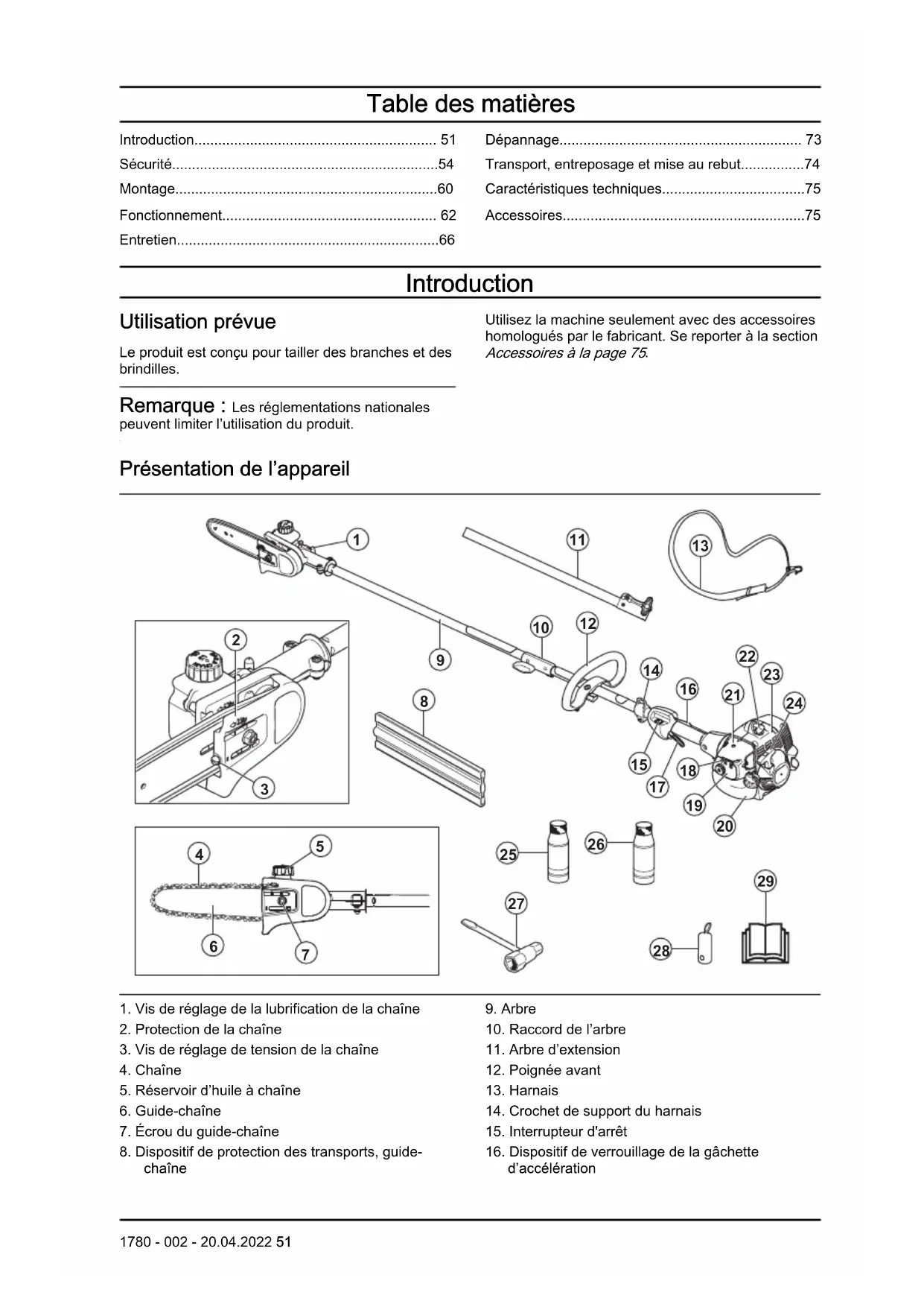 - Respecter les règles de sécurité en vigueur pour les travaux à proximité de lignes électriques aériennes. La chute de branches peut provoquer un court-circuit. 1780 - 002 - 20.04.2022 55• Ne jamais se tenir directement sous une branche qui est en cours de coupe. Cela peut entraîner des blessures graves, voire mortelles.