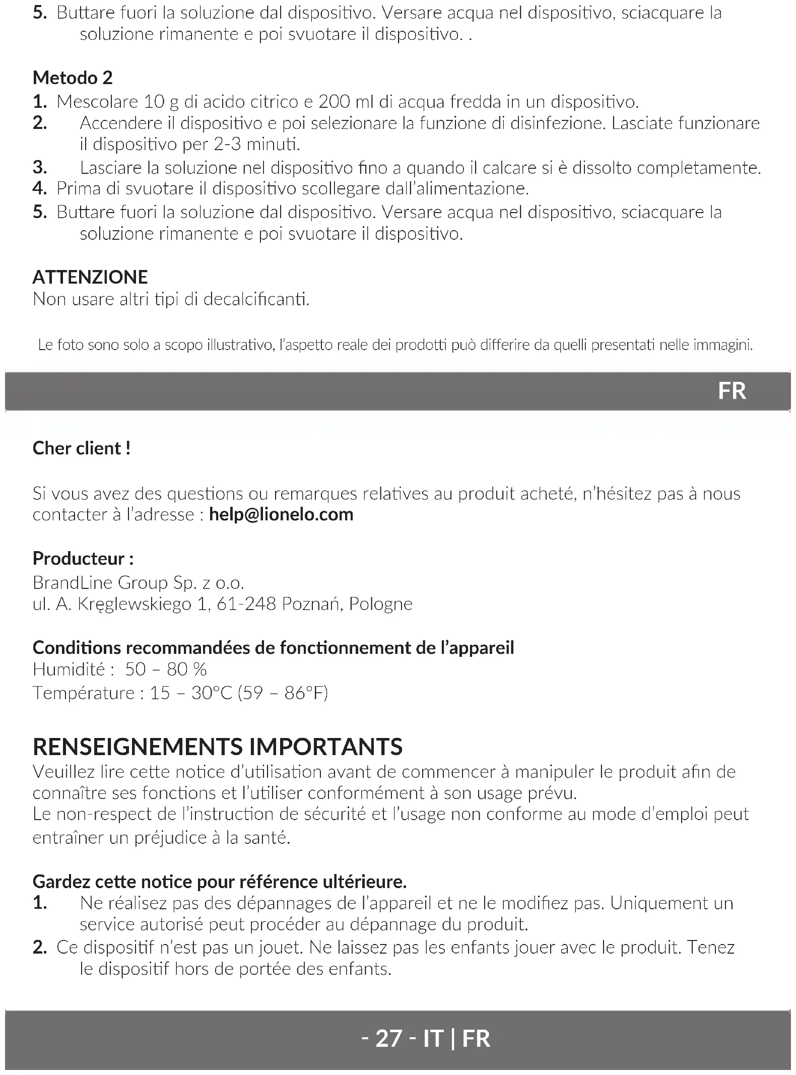 Cher client ! Si vous avez des quesons ou remarques relaves au produit acheté, n’hésitez pas à nous contacter à l’adresse : help@lionelo.com Producteur : BrandLine Group Sp. z o.o. ul. A. Kręglewskiego 1, 61-248 Poznań, Pologne Condions recommandées de fonconnement de l’appareil Humidité : 50 – 80 % Température : 15 – 30°C (59 – 86°F) RENSEIGNEMENTS IMPORTANTS Veuillez lire cee noce d’ulisaon avant de commencer à manipuler le produit an de connaître ses foncons et l’uliser conformément à son usage prévu. Le non-respect de l’instrucon de sécurité et l’usage non conforme au mode d’emploi peut entraîner un préjudice à la santé. Gardez cee noce pour référence ultérieure.