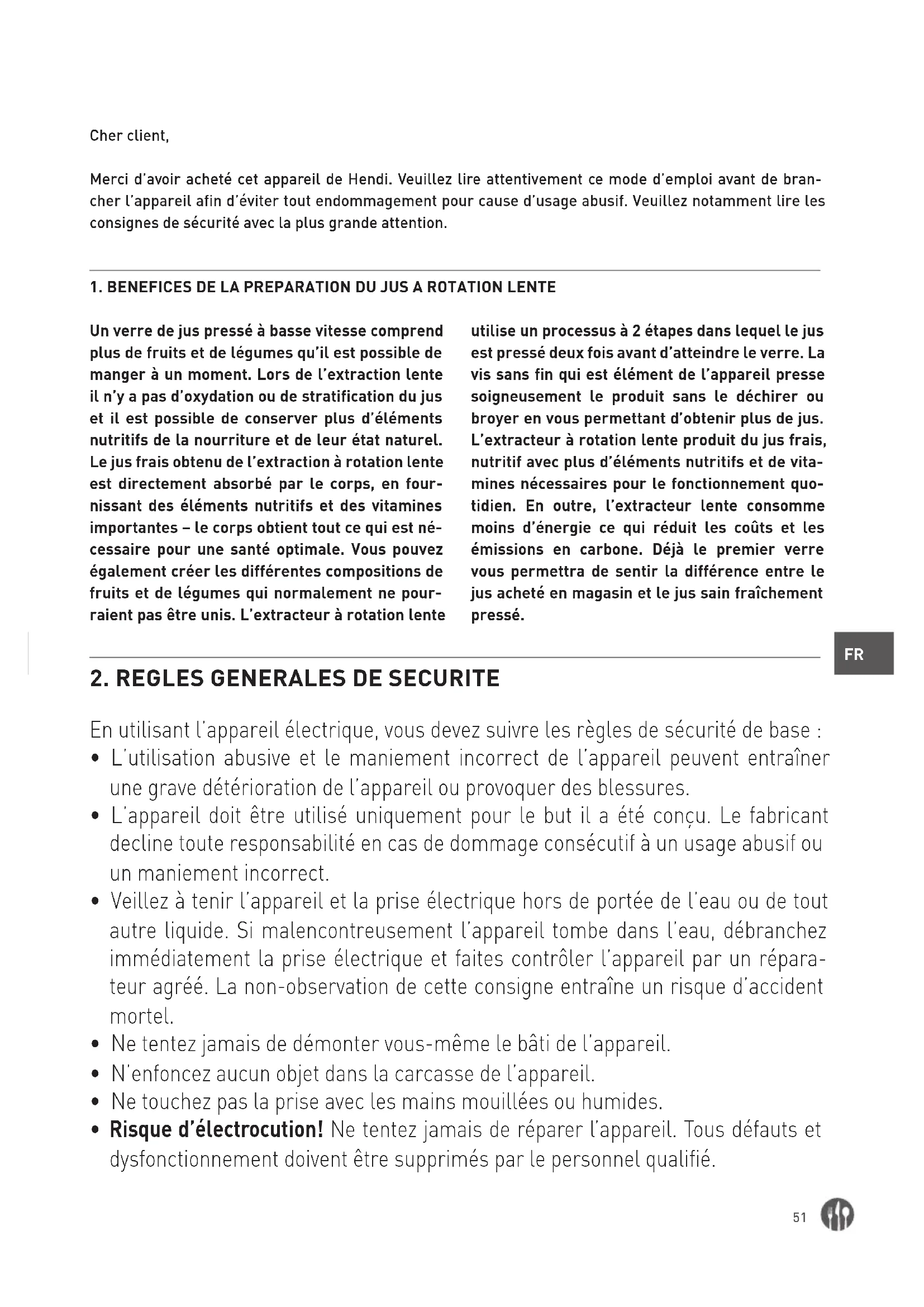 Lisez attentivement les instructions contenues dans le mode d’emploi et suivez les conseils parce que l’extracteur à rotation faible est utilisé de manière différente à l’extracteur traditionnel.