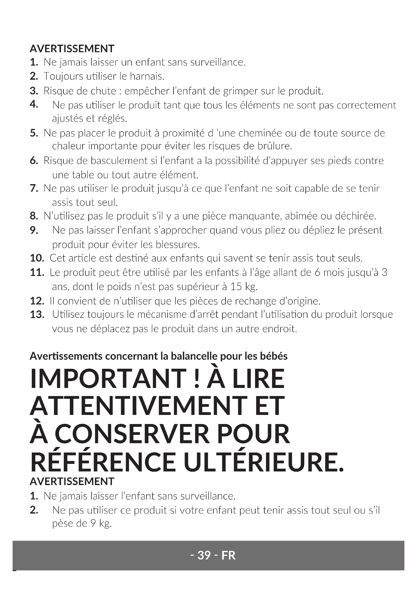 Ulisez toujours le mécanisme d’arrêt pendant l’ulisaon du produit lorsque vous ne déplacez pas le produit dans un autre endroit. Averssements concernant la balancelle pour les bébés IMPORTANT ! À LIRE ATTENTIVEMENT ET À CONSERVER POUR RÉFÉRENCE ULTÉRIEURE. AVERTISSEMENT