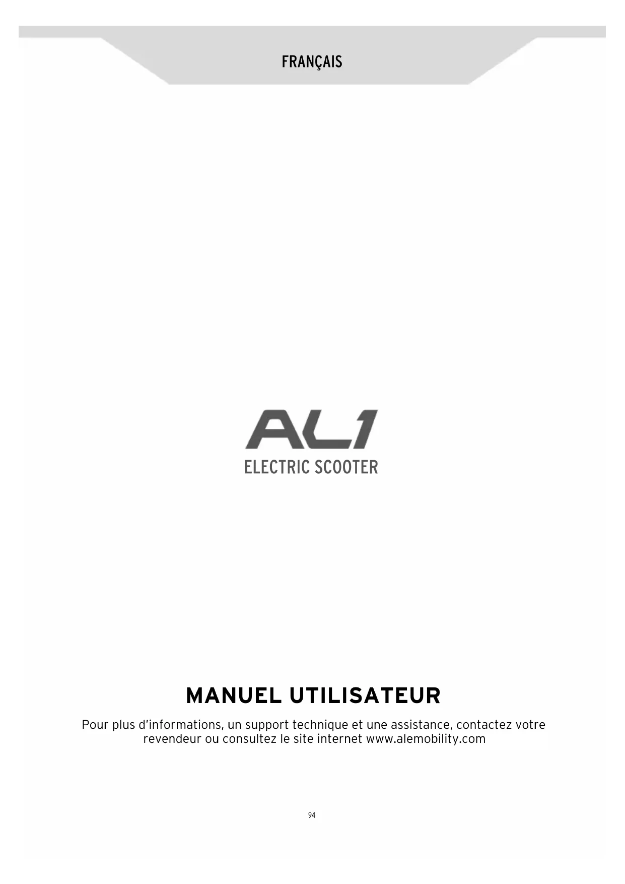 MANUEL UTILISATEUR FRANÇAIS Pour plus d’informations, un support technique et une assistance, contactez votre revendeur ou consultez le site internet www.alemobility.com95 SOMMAIRE
