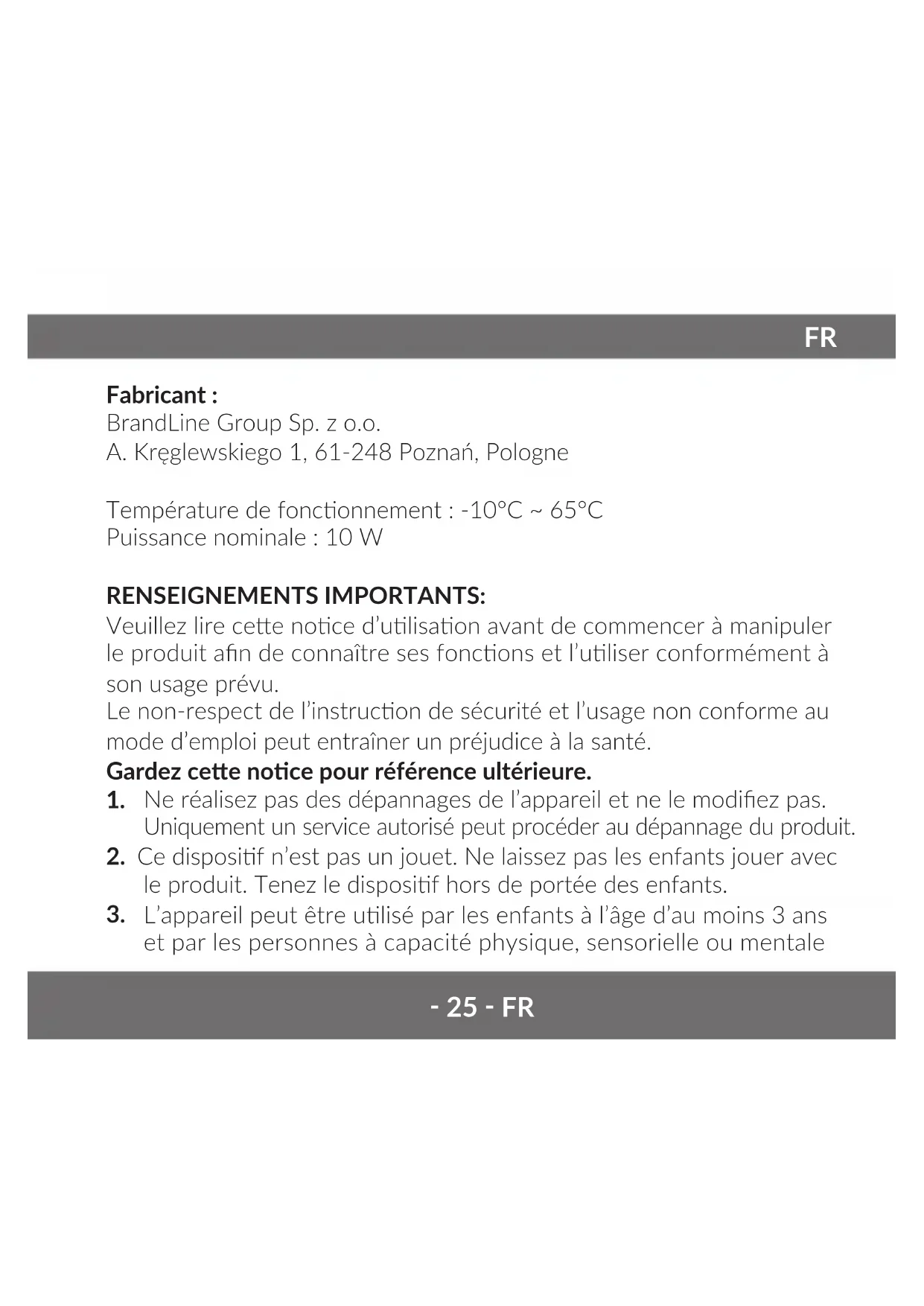 Fabricant : BrandLine Group Sp. z o.o. A. Kręglewskiego 1, 61-248 Poznań, Pologne Température de fonconnement : -10°C ~ 65°C Puissance nominale : 10 W RENSEIGNEMENTS IMPORTANTS: Veuillez lire cee noce d’ulisaon avant de commencer à manipuler le produit an de connaître ses foncons et l’uliser conformément à son usage prévu. Le non-respect de l’instrucon de sécurité et l’usage non conforme au mode d’emploi peut entraîner un préjudice à la santé. Gardez cee noce pour référence ultérieure.