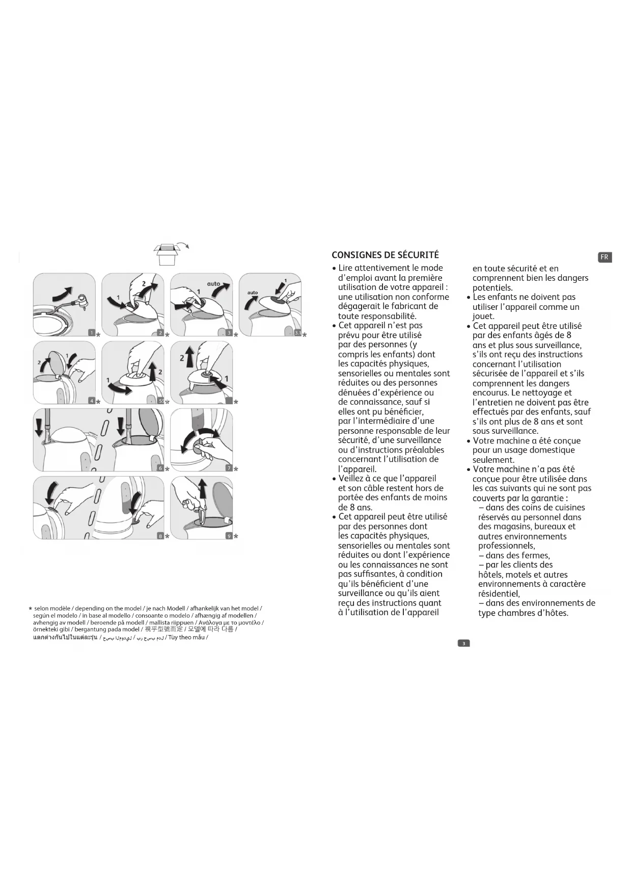 - Pour votre sécurité, cet appareil est conforme aux normes et réglementations applicables (Directives Basse Tension, Compatibilité Electromagnétique, Matériaux en contact des aliments, Environnement,...).• Branchez l’appareil uniquement sur une prise secteur reliée à la terre. Vérifiez que la tension d’alimentation indiquée sur la plaque signalétique de l’appareil correspond bien à celle de votre installation.• Toute erreur de branchement annule la garantie.• Notre garantie exclut les bouilloires qui ne fonctionnent pas ou mal du fait de l’absence de détartrage.• Ne pas laisser pendre le câble d’alimentation à portée de main des enfants.• Ne pas débrancher la fiche de la prise en tirant sur le câble.• Toute intervention autre que le nettoyage et l’entretien usuel par le client doit être effectuée par un centre service agréé.• Tous les appareils sont soumis à un contrôle qualité sévère. Des essais d’utilisation pratiques sont faits avec des appareils pris au hasard ce qui explique d’éventuelles traces d’utilisation.• N’utilisez pas de tampons abrasifs.• Pour enlever le filtre anti tartre, retirez la bouilloire de son socle et laissez refroidir l’appareil. N’enlevez jamais le filtre quand l’appareil est rempli d’eau chaude.• N’utilisez jamais une autre méthode de détartrage que celle préconisée. FR76