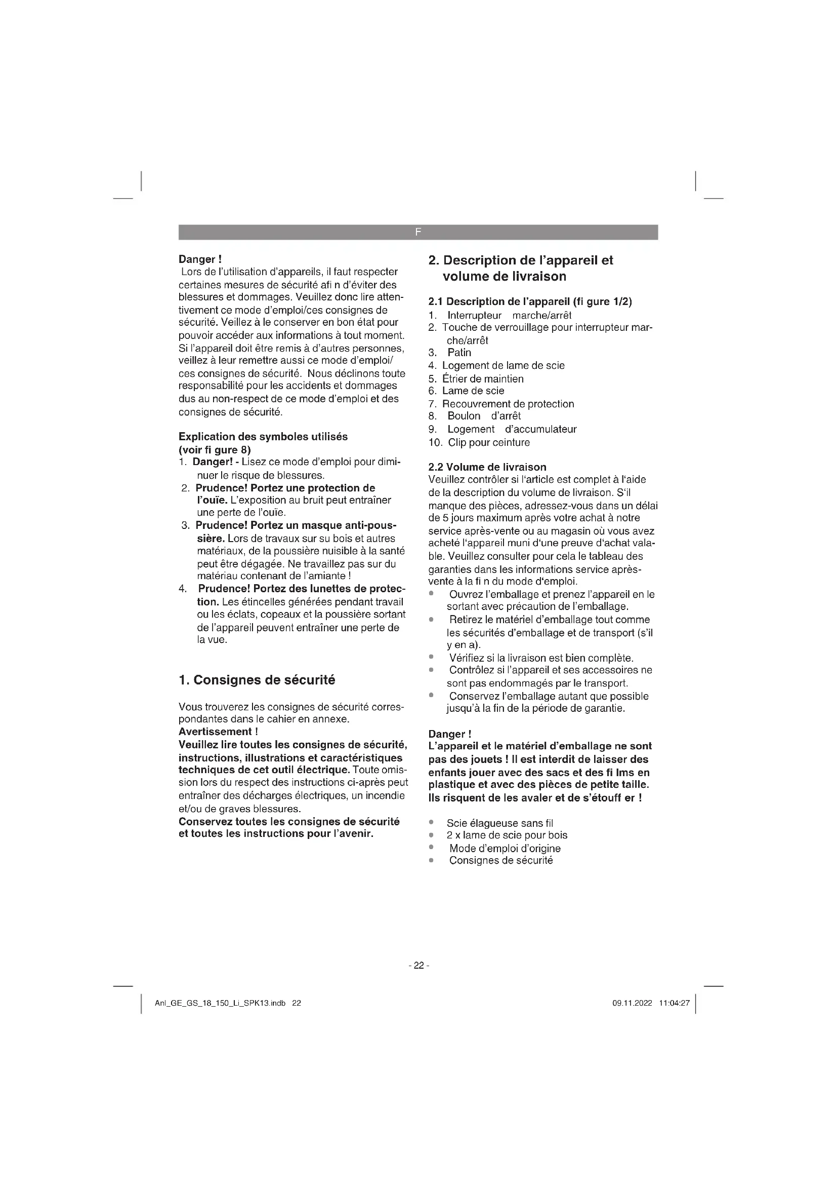 Portez des gants. Prudence ! Risques résiduels Même en utilisant cet outil électrique confor- mément aux prescriptions, il reste toujours des risques résiduels. Les dangers suivants peuvent apparaître en rapport avec la const- Anl_GE_GS_18_150_Li_SPK13.indb 23Anl_GE_GS_18_150_Li_SPK13.indb 23 09.11.2022 11:04:2809.11.2022 11:04:28F