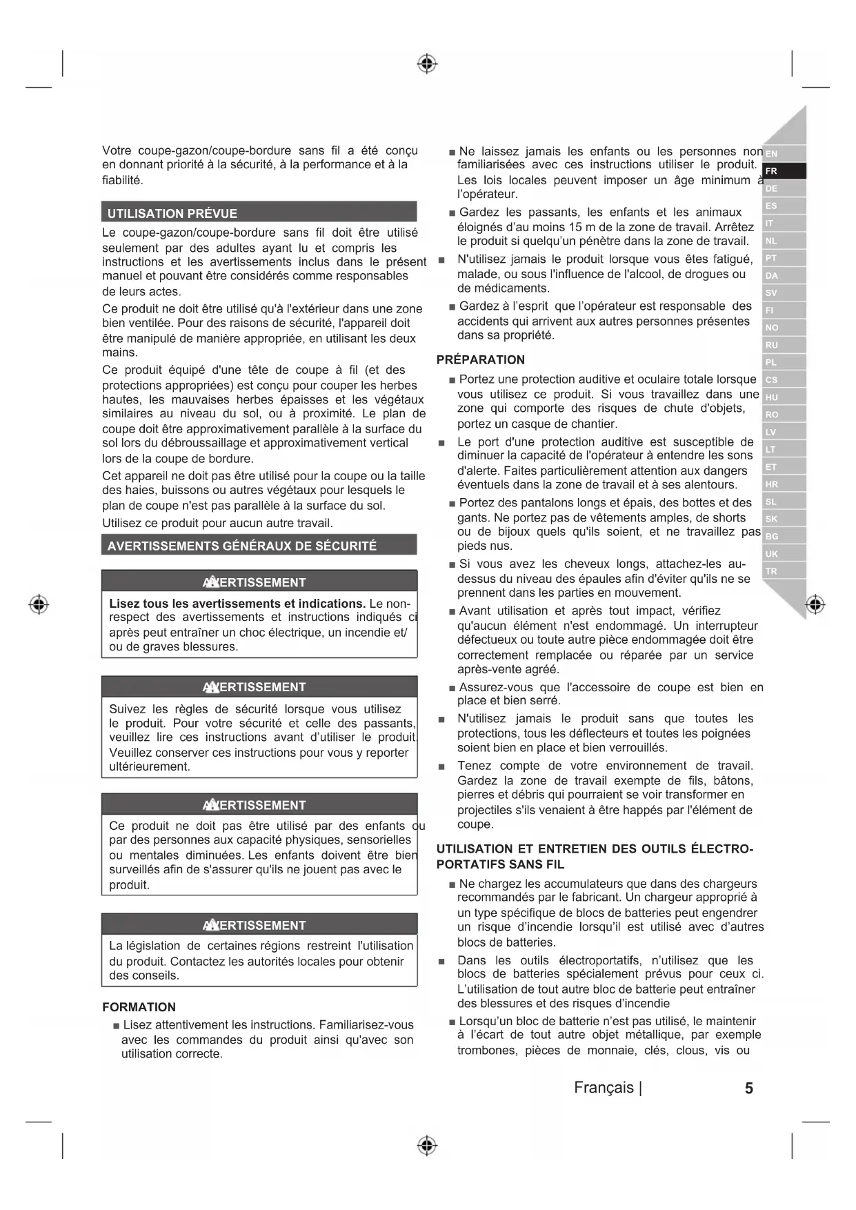 ■ Ne laissez jamais les enfants, les personnes aux capacités physiques, sensorielles ou mentales réduites ou n’ayant pas l’habitude ou les connaissances suffisantes, ni les personnes non familiarisées avec ces instructions utiliser ce produit. ■ Veillez à ce que votre zone de travail soit bien éclairée (lumière du jour ou lumière artificielle). ■ Évitez d'utiliser l'appareil sur de l'herbe mouillée. ■ Gardez un bon appui et un bon équilibre en permanence, particulièrement dans les pentes. ■ Ne reculez pas lors de l'utilisation du produit. ■ Marchez, ne courez jamais. ■ Maintenez l'accessoire de coupe en dessous du niveau de votre taille. ■ N'utilisez jamais le produit si ses protections sont absentes ou endommagées. ■ N'utilisez jamais de fil de coupe en métal avec votre coupe-bordures. ■ Maintenez toujours vos mains et vos pieds éloignés de la tête de fil, en particulier lors de la mise en marche du coupe-bordures. ■ Faites attention, les éléments de coupe continuent de tourner une fois le moteur coupé. ■ Prenez garde aux objets projetés par les éléments de coupe. Dégagez la zone de travail des débris tels que les petites pierres, le gravier et autres objets étrangers avant de commencer le travail. Des câbles ou de la ficelle pourraient s'emmêler dans les éléments de coupe. ■ Arrêtez l'appareil et retirez la batterie avant de : ● réaliser des réparations ● laisser le produit sans surveillance ● nettoyer votre produit ● changer un accessoire ● vérifier tout dommage éventuel après avoir heurté un objet ● vérifier tout dommage éventuel au cas où le produit se mettrait à vibrer de façon anormale ● réaliser des opérations d’entretien ■ Portez une protection auditive et oculaire totale lorsque vous utilisez ce produit. Si vous travaillez dans une zone qui comporte des risques de chute d'objets, portez un casque de chantier. ■ Le port d'une protection auditive est susceptible de diminuer la capacité de l'opérateur à entendre les sons d'alerte. Faites particulièrement attention aux dangers éventuels dans la zone de travail et à ses alentours. ■ Portez des pantalons longs et épais, des bottes et des gants. Ne portez pas de vêtements amples, de shorts ou de bijoux quels qu'ils soient, et ne travaillez pas pieds nus. ■ Si vous avez les cheveux longs, attachez-les au- dessus du niveau des épaules afin d'éviter qu'ils ne se prennent dans les parties en mouvement. ■ La petite lame montée sur le carter de protection est conçue pour couper à la bonne longueur le fil qui vient de s’allonger, pour des performances sûres et optimales. Elle est très coupante : veillez à ne pas la toucher, en particulier lorsque vous nettoyez l’outil. ■ Assurez-vous que les ouïes de ventilation sont en permanence exemptes de débris. ■ Avant utilisation et après tout impact, vérifiez qu'aucun élément n'est endommagé. Un interrupteur défectueux ou toute autre pièce endommagée doit être correctement remplacée ou réparée par un service après-vente agréé. ■ Assurez-vous que l'accessoire de coupe est bien en place et bien serré. ■ Assurez-vous que toutes les protections, tous les déflecteurs et toutes les poignées sont bien en place et bien verrouillés. ■ Ne modifiez pas le produit de quelque manière que ce soit, sous peine d'augmenter les risques de blessures infligées à vous-même et aux autres. ■ N'utilisez que du fil de coupe fourni par le fabricant. N'utilisez aucun autre accessoire de coupe. ■ Éteignez immédiatement l'appareil et enlever la batterie en cas d'accident ou de panne. N'utilisez plus le produit jusqu'à ce qu'il ait été entièrement vérifié par un centre de service agréé. AVERTISSEMENT Assurez-vous que la lame de taille est correctement positionnée et sécurisée avant toute utilisation.