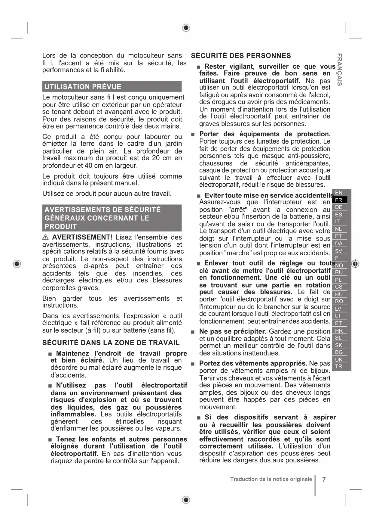 Traduction de la notice originale Lors de la conception du motoculteur sans fi l, l'accent a été mis sur la sécurité, les performances et la fi abilité.