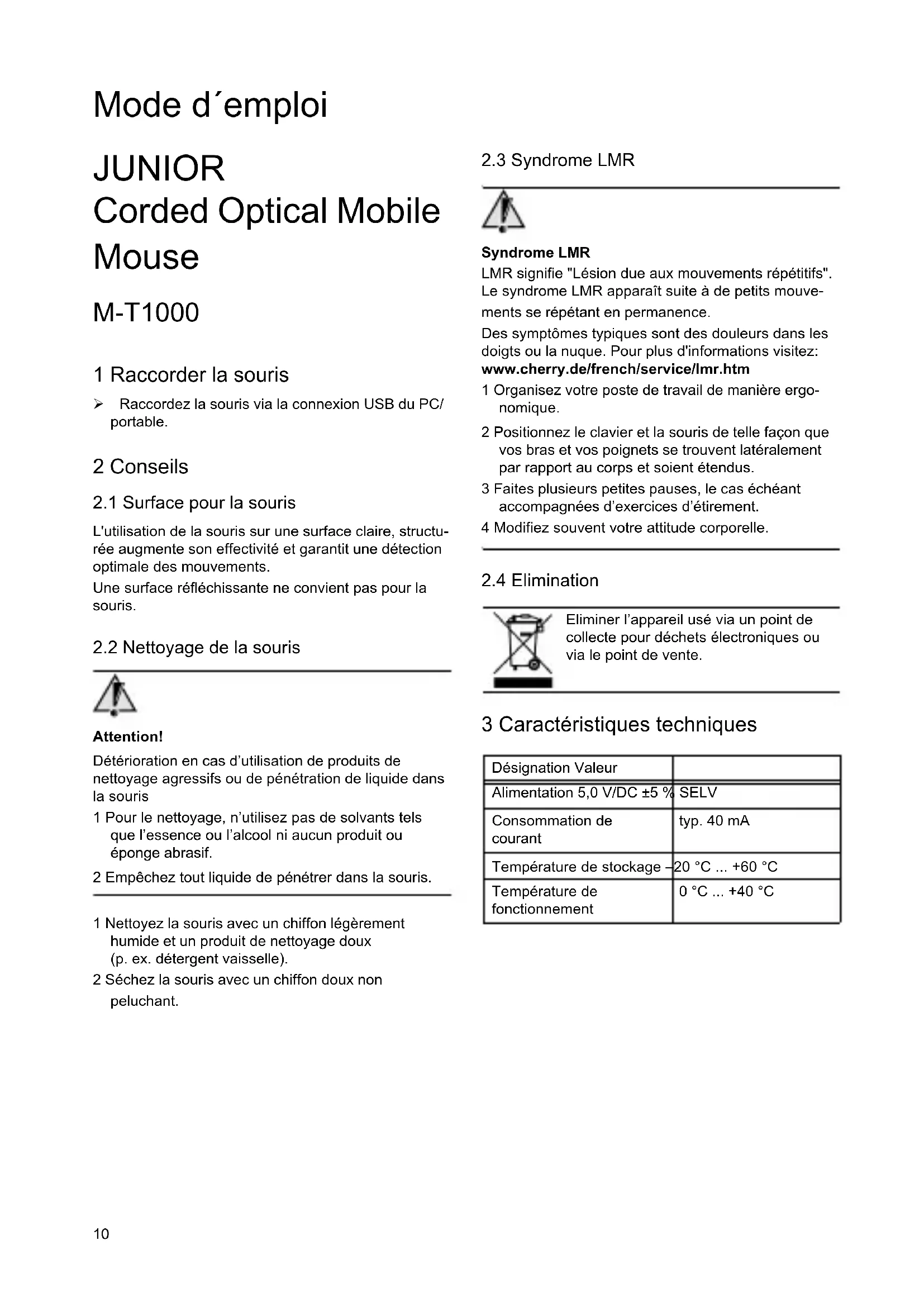 JUNIOR MT1000 - Souris d'ordinateur Cherry - Notice d'utilisation et mode d'emploi gratuit