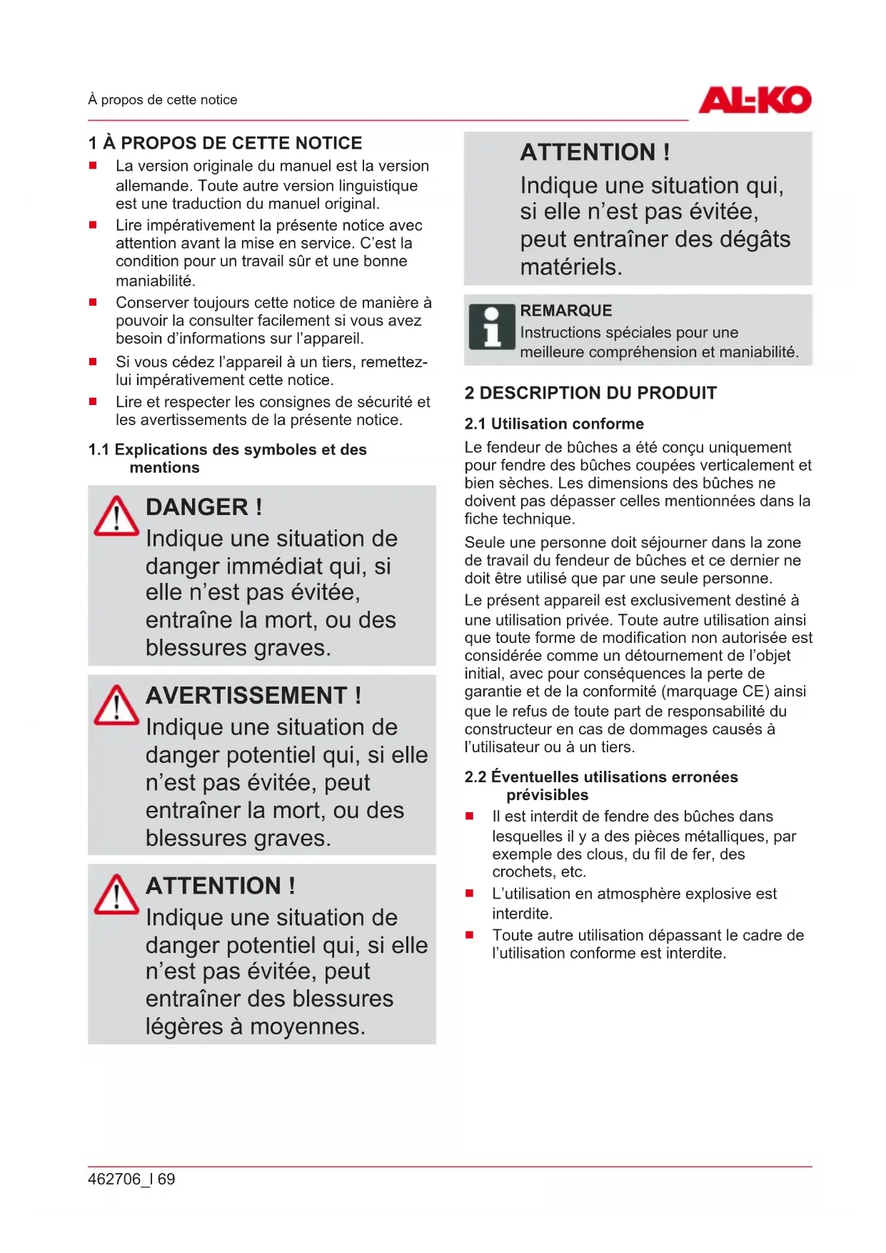 Nous déclarons par la présente que ce produit, sous la forme mise sur le marché, répond aux dispositions des directives CE harmonisées, des normes de sécurité de l’UE et des normes spécifiques aux produits. Produit Fendeur de bûches Numéro de série G4064065 Fabricant AL-KO Geräte GmbH Ichenhauser Str. 14 D-89359 Kötz Responsable de la documentation Andreas Hedrich Ichenhauser Str. 14 D-89359 Kötz Type KHS 3704 KHS 5204 KHS 8552 Directives UE 2006/42/CE 2014/30/UE 2011/65/UE Normes harmonisées EN 60335-1 EN 60204-1 EN 60204-1/A1 EN ISO 12100 EN 61000-3-2 EN 61000-3-11 EN 609-1 Kötz, 11/10/2017 Wolfgang Hergeth Directeur général462706_l 89 Traducción del manual original de instrucciones TRADUCCIÓN DEL MANUAL ORIGINAL DE INSTRUCCIONES Índice 1 Acerca de este manual de instrucciones ........................................................................................ 91