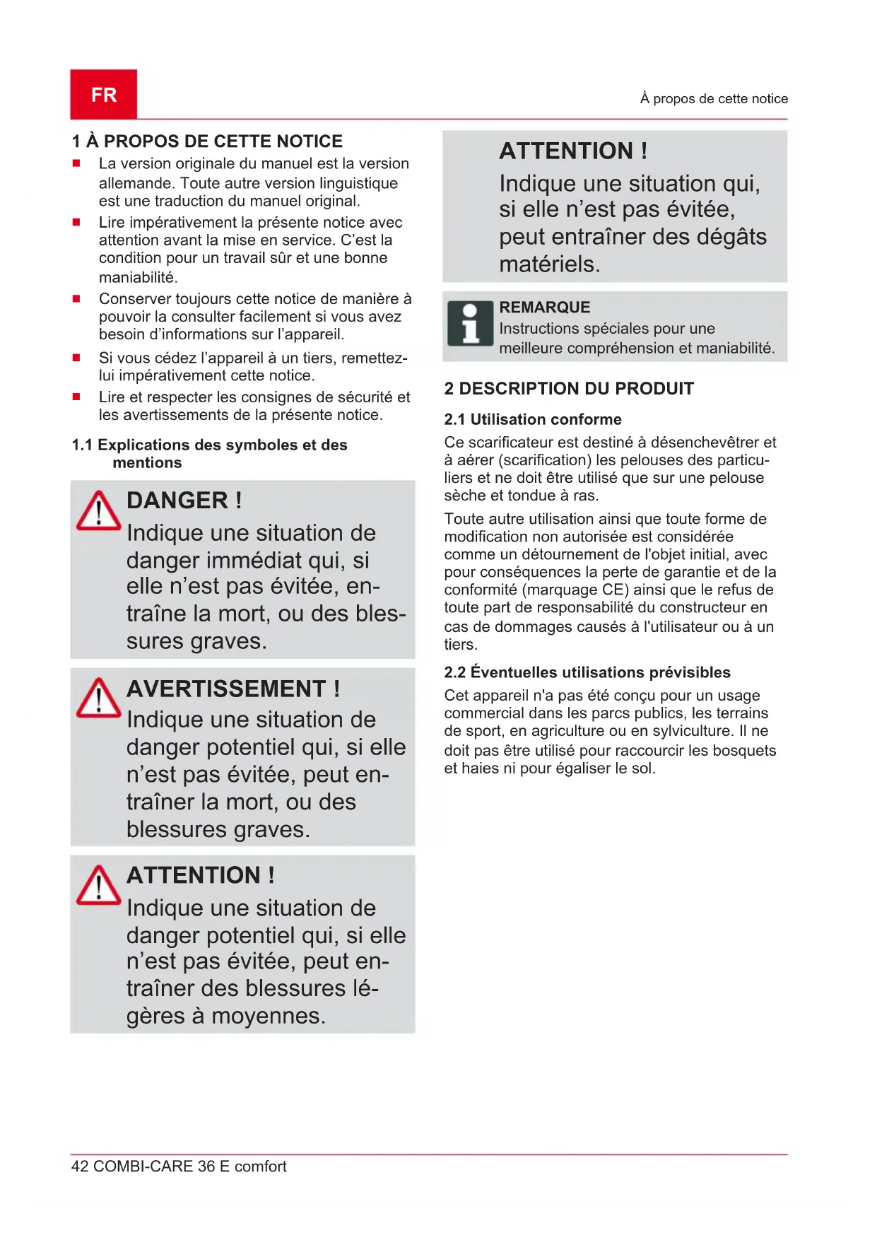 Sym- bole Signification Lire la notice d'utilisation avant la mise en service. Éloigner les tierces personnes de la zone à risques ! Garder une distance de sécurité. Maintenir à distance les mains et les pieds de l'outil de coupe ! Avant les travaux de maintenance, d’entretien et de nettoyage, débrancher l’appareil du secteur. Ne pas rouler sur le câble d’alimenta- tion. Risque d’électrocution si le câble d’alimentation est endommagé. Porter une protection auditive et des lunettes de protection. Débrancher le câble d’alimentation du secteur s’il s’est accroché ou s’il a été endomma- gé. Procédure pour démarrer le moteur (voir chapitre 6.5 "Démarrer et arrêter le moteur (09)", page48) Niveau de puissance acoustique ga- ranti LwAFR 44 COMBI-CARE 36 E comfort Consignes de sécurité