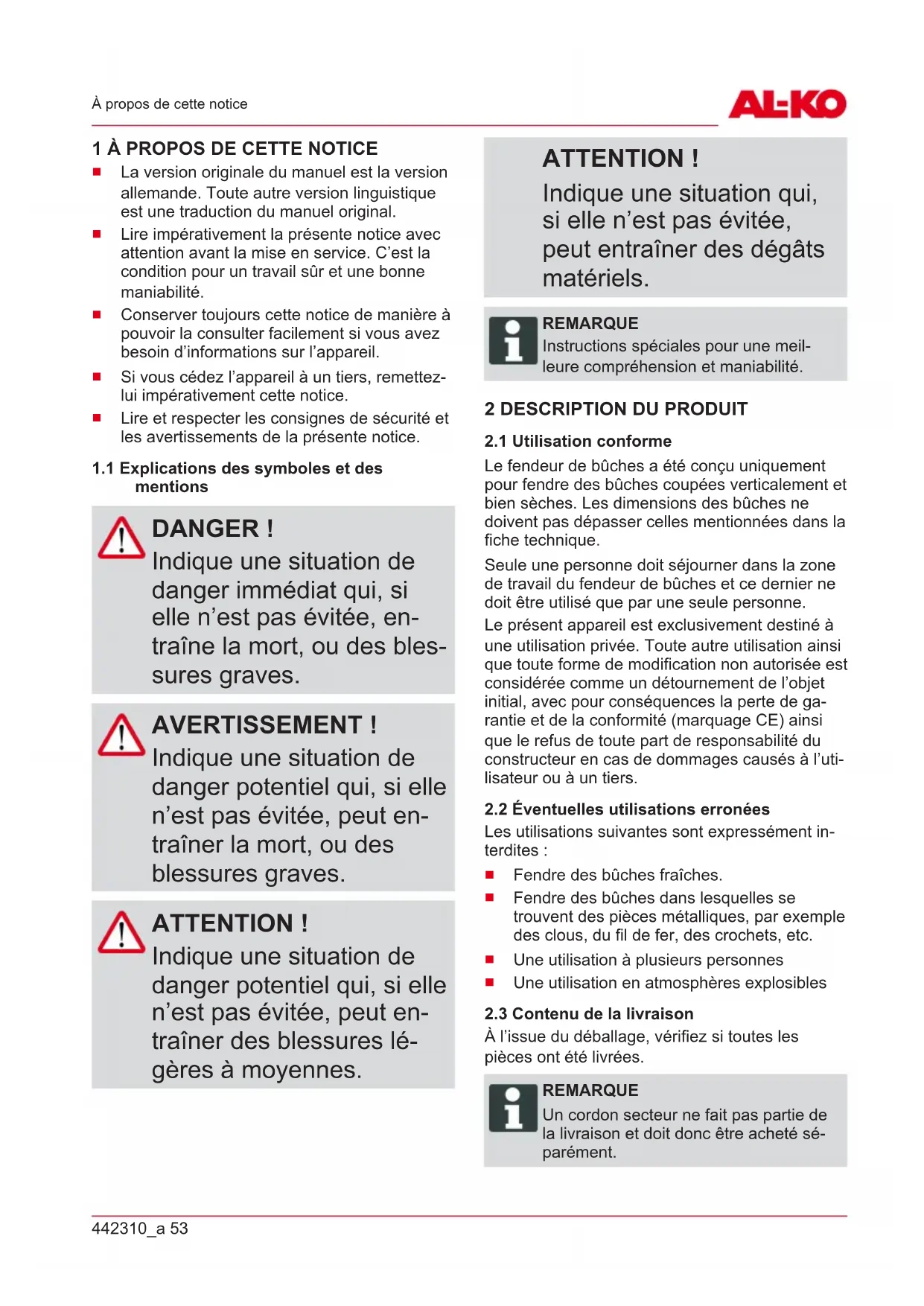 mentions DANGER! Indique une situation de danger immédiat qui, si elle n’est pas évitée, en- traîne la mort, ou des bles- sures graves. AVERTISSEMENT ! Indique une situation de danger potentiel qui, si elle n’est pas évitée, peut en- traîner la mort, ou des blessures graves. ATTENTION ! Indique une situation de danger potentiel qui, si elle n’est pas évitée, peut en- traîner des blessures lé- gères à moyennes. ATTENTION! Indique une situation qui, si elle n’est pas évitée, peut entraîner des dégâts matériels. REMARQUE Instructions spéciales pour une meil- leure compréhension et maniabilité.