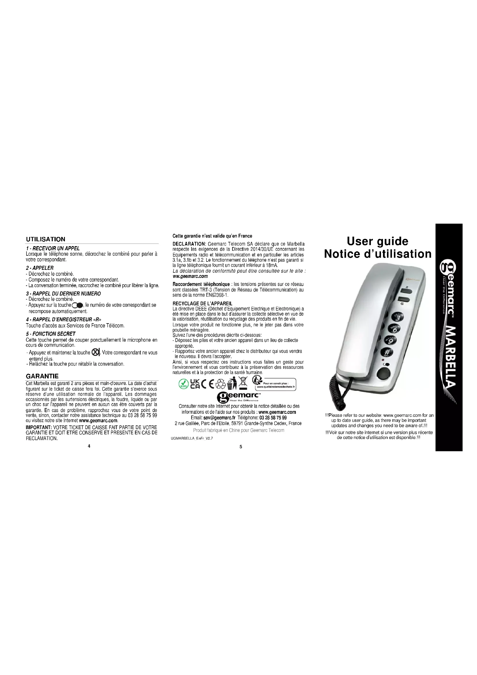Cette touche permet de couper ponctuellement le microphone en cours de communication. - Appuyez et maintenez la touche . Votre correspondant ne vous entend plus. - Relâchez la touche pour rétablir la conversation. GARANTIE Cet Marbella est garanti 2 ans pièces et main-d'oeuvre. La date d’achat figurant sur le ticket de caisse fera foi. Cette garantie s’exerce sous réserve d’une utilisation normale de l’appareil. Les dommages occasionnés par les surtensions électriques, la foudre, liquide ou par un choc sur l’appareil ne peuvent en aucun cas être couverts par la garantie. En cas de problème, rapprochez vous de votre point de vente, sinon, contacter notre assistance technique au 03 28 58 75 99 ou visitez notre site Internet www.geemarc.com. IMPORTANT: VOTRE TICKET DE CAISSE FAIT PARTIE DE VOTRE GARANTIE ET DOIT ETRE CONSERVE ET PRESENTE EN CAS DE RECLAMATION. Cette garantie n’est valide qu’en France DECLARATION: Geemarc Telecom SA déclare que ce Marbella respecte les exigences de la Directive 2014/30/UE concernant les Equipements radio et télécommunication et en particulier les articles 3.1a, 3.1b et 3.2. Le fonctionnement du téléphone n’est pas garanti si la ligne téléphonique fournit un courant inférieur à 18mA. La déclaration de conformité peut être consultée sur le site : ww.geemarc.com Raccordement téléphonique : les tensions présentes sur ce réseau sont classées TRT-3 (Tension de Réseau de Télécommunication) au sens de la norme EN62368-1.