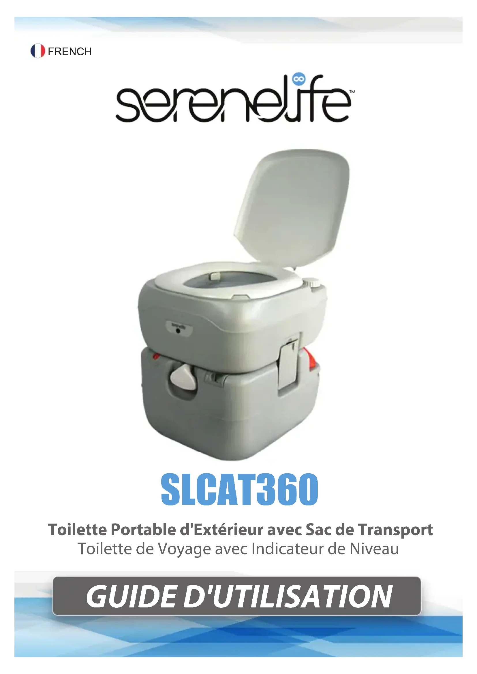 Note: Puede quedar una pequeña cantidad de agua en el depósito superior, pero será inofensiva durante el almacenamiento.Preguntas? Comentarios? Estamos para ayudarte! https://serenelifehome.com/pages/contact-usGUIDE D'UTILISATION FRENCH Toilette Portable d'Extérieur avec Sac de Transport Toilette de Voyage avec Indicateur de Niveau SLCAT3602 www.serenelifehome.com Introduction La toilette portable ore une utilisation simple et une élimination pratique des déchets. Avant d'utiliser votre toilette portable, nous vous recommandons de lire ce manuel attentivement. Familiarisez-vous avec votre toilette portable et ses composants. Comme avec tout produit de qualité, une utilisation et un fonctionnement appropriés éliminent les travaux d'entretien inutiles. Caractéristiques: