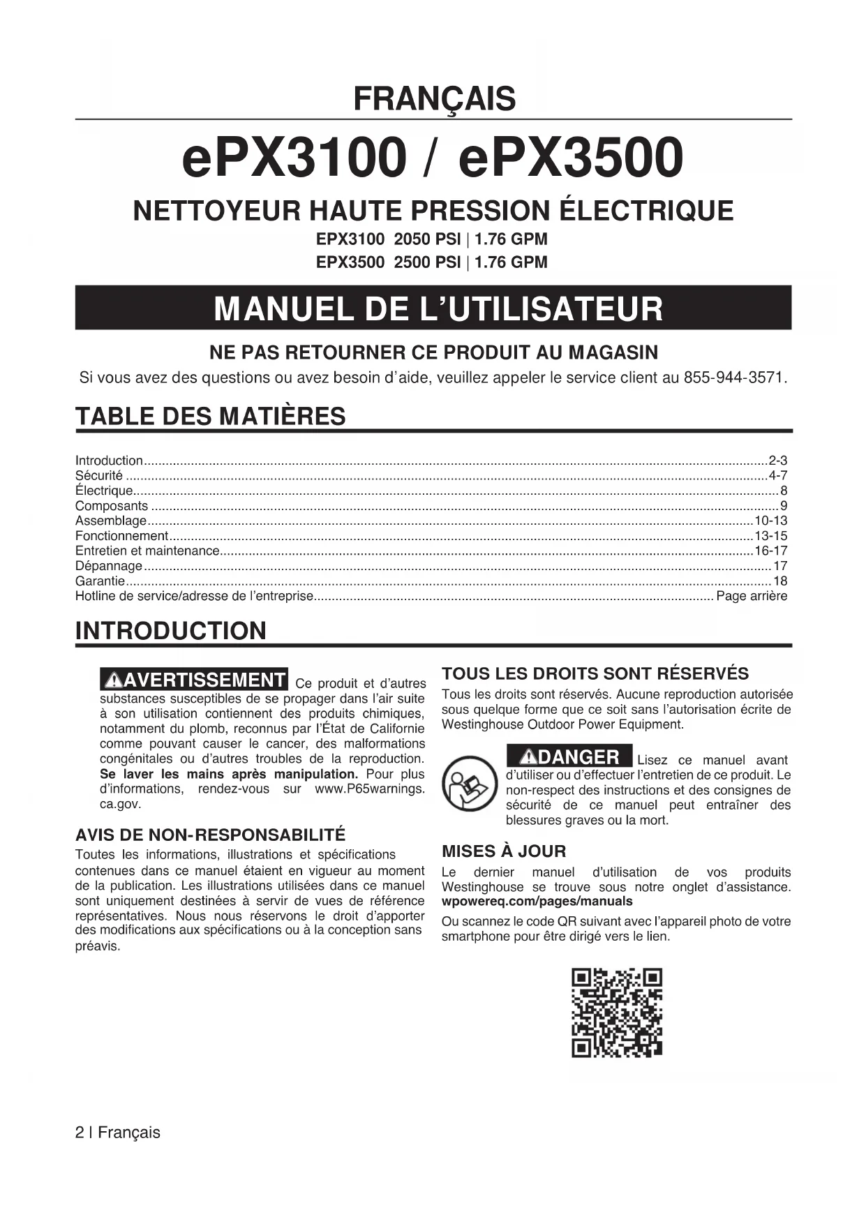 INTRODUCTION AVERTISSEMENT Ce produit et d’autres substances susceptibles de se propager dans l’air suite à son utilisation contiennent des produits chimiques, notamment du plomb, reconnus par l’État de Californie comme pouvant causer le cancer, des malformations congénitales ou d’autres troubles de la reproduction. Se laver les mains après manipulation. Pour plus d’informations, rendez-vous sur www.P65warnings.ca.gov. AVIS DE NON-RESPONSABILITÉToutes les informations, illustrations et spécications contenues dans ce manuel étaient en vigueur au moment de la publication. Les illustrations utilisées dans ce manuel sont uniquement destinées à servir de vues de référence représentatives. Nous nous réservons le droit d’apporter des modications aux spécications ou à la conception sans préavis.TOUS LES DROITS SONT RÉSERVÉSTous les droits sont réservés. Aucune reproduction autorisée sous quelque forme que ce soit sans l’autorisation écrite de Westinghouse Outdoor Power Equipment. DANGER Lisez ce manuel avant d’utiliser ou d’effectuer l’entretien de ce produit. Le non-respect des instructions et des consignes de sécurité de ce manuel peut entraîner des blessures graves ou la mort.MISES À JOURLe dernier manuel d’utilisation de vos produits Westinghouse se trouve sous notre onglet d’assistance. wpowereq.com/pages/manualsOu scannez le code QR suivant avec l’appareil photo de votre smartphone pour être dirigé vers le lien.