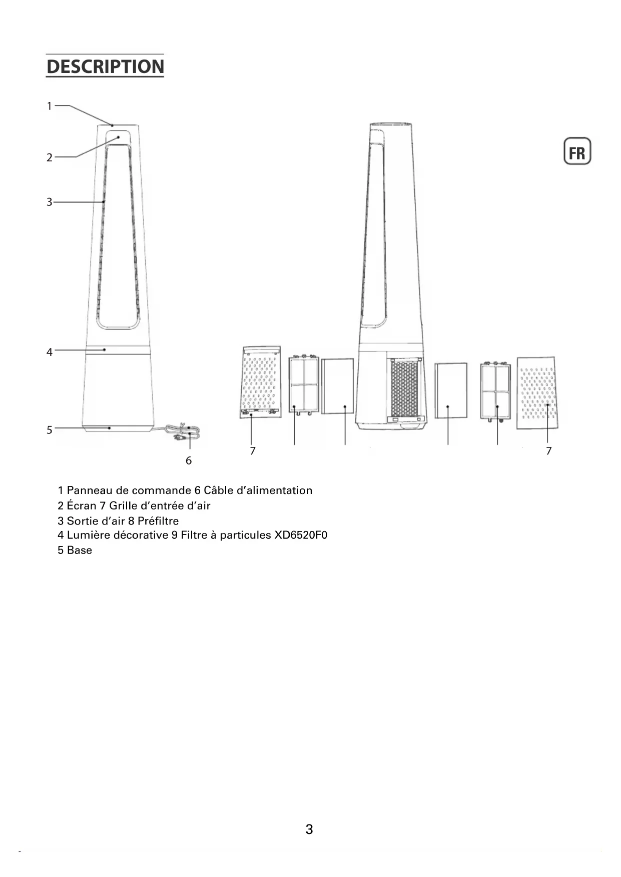 1 Panneau de commande 6 Câble d’alimentation 2 Écran 7 Grille d’entrée d’air 3 Sortie d’air 8 Préltre 4 Lumière décorative 9 Filtre à particules XD6520F0 5 Base