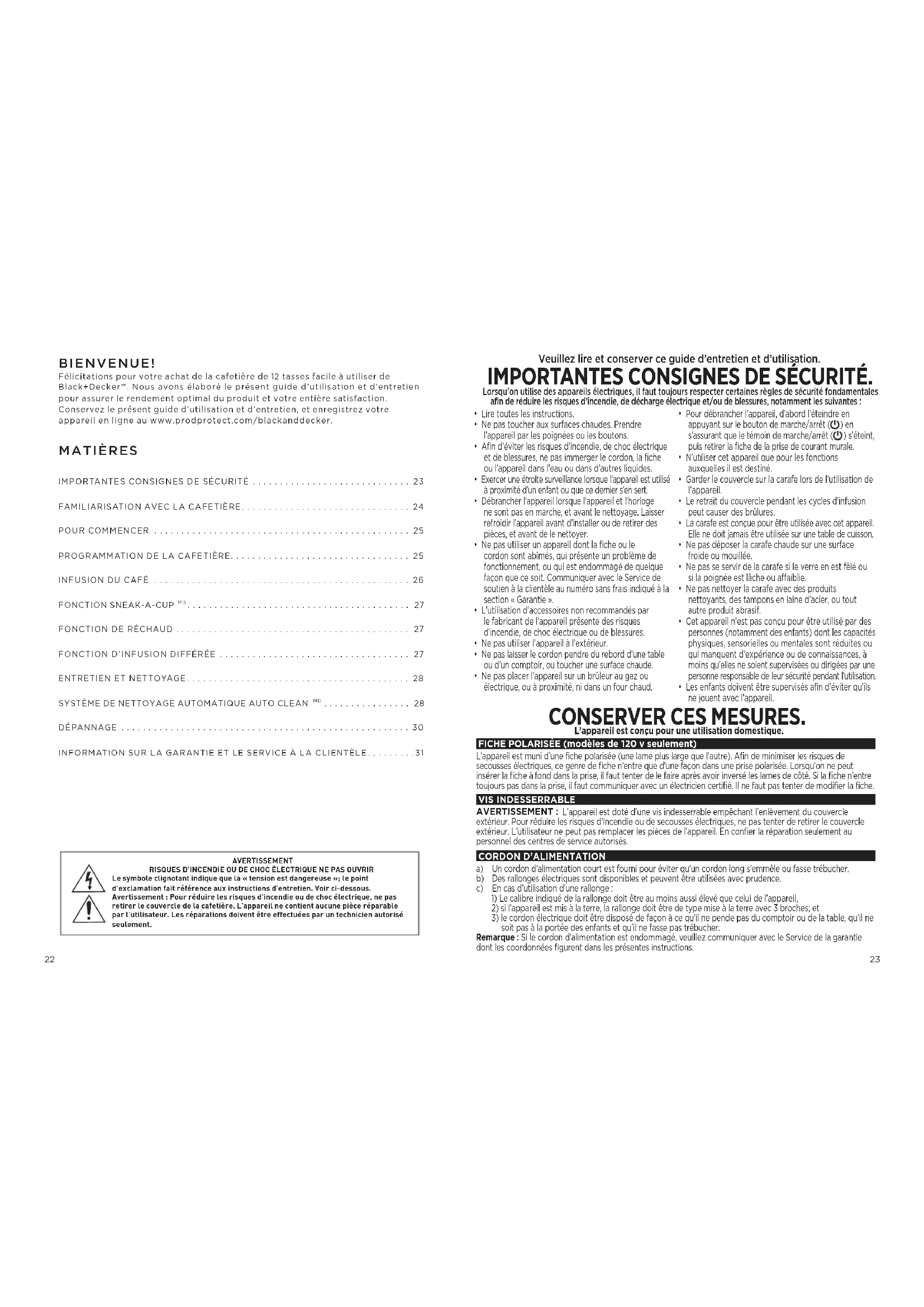 DÉPANNAGE .....................................................30 INFORMATION SUR LA GARANTIE ET LE SERVICE À LA CLIENTÈLE.........31 BIENVENUE! Félicitations pour votre achat de la cafetière de 12 tasses facile à utiliser de Black+Decker™. Nous avons élaboré le présent guide d’utilisation et d’entretien pour assurer le rendement optimal du produit et votre entière satisfaction. Conservez le présent guide d’utilisation et d’entretien, et enregistrez votre appareil en ligne au www.prodprotect.com/blackanddecker.