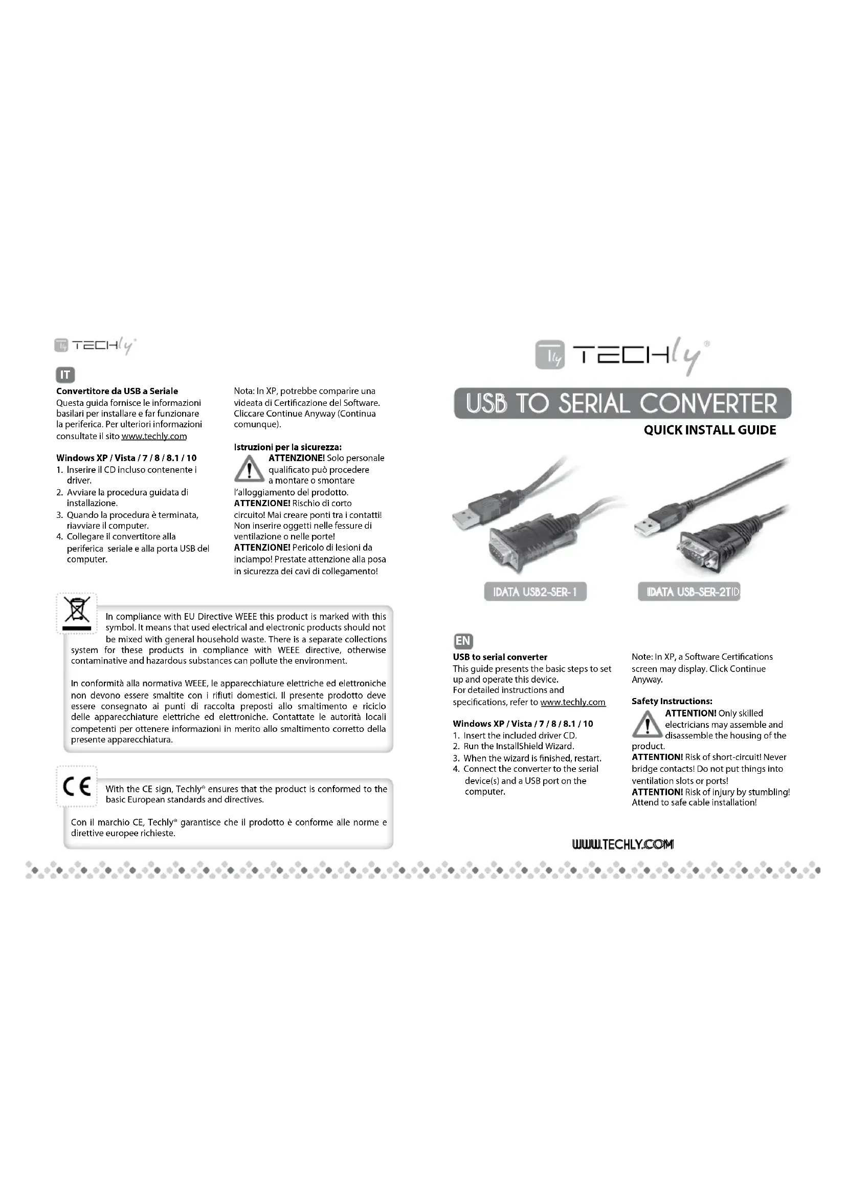 dispositif série et un port USB de votre ordinateur. Remarque: Sur XP, un écran de certification du logiciel pourrait s’afficher. Cliquez sur Continue Anyway/ Continuer néanmoins. Consignes de sécurité: ATTENTION! Seuls des électriciens qualiés peuvent monter et démonter le boîtier du produit. ATTENTION! Risque de court-circuit! contacts Jamais pont! Ne pas mettre les choses dans les fentes de ventilation ou de ports! ATTENTION! Risque de blessures en trébuchant! Assister à l’installation de câbles en toute sécurité! Convertidor de USB a Puerto Serie Esta guia presenta los pasos básicos para su conguración y operatión de este dispositivo. Para obtener más información, visite www.techly.com Windows XP / Vista / 7 / 8 / 8.1 / 10