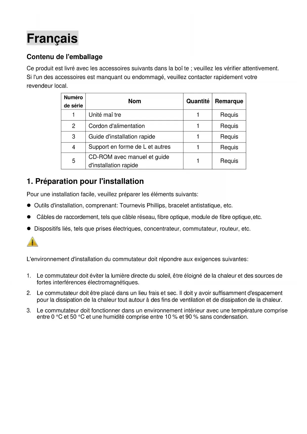 Pour une installation facile, veuillez préparer les éléments suivants: Outils d'installation, comprenant: Tournevis Phillips, bracelet antistatique, etc. Câbles de raccordement, tels que câble réseau, fibre optique, module de fibre optique, etc. Dispositifs liés, tels que prises électriques, concentrateur, commutateur, routeur, etc. L'environnement d'installation du commutateur doit répondre aux exigences suivantes: