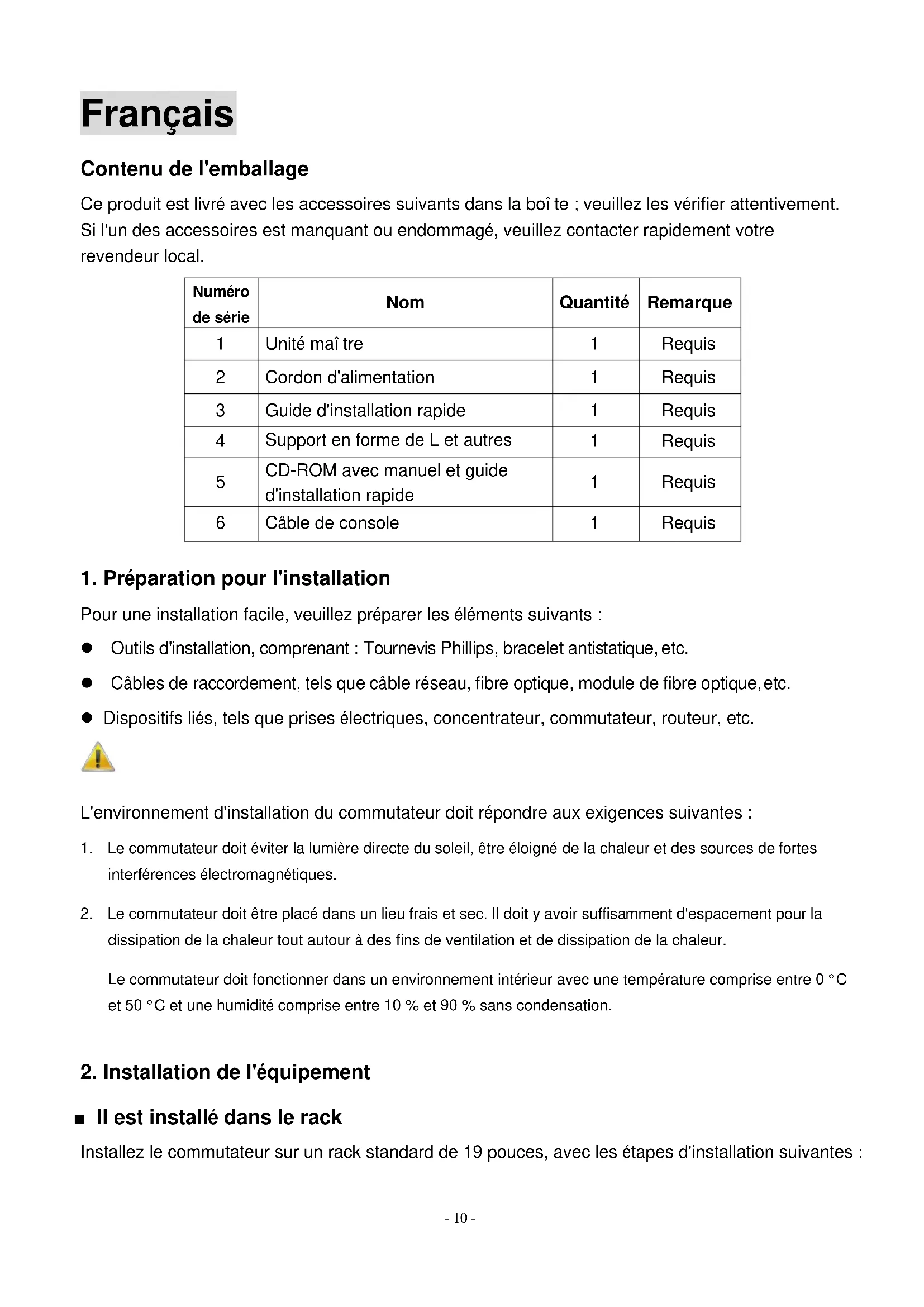Pour une installation facile, veuillez préparer les éléments suivants : Outils d'installation, comprenant : Tournevis Phillips, bracelet antistatique, etc. Câbles de raccordement, tels que câble réseau, fibre optique, module de fibre optique, etc. Dispositifs liés, tels que prises électriques, concentrateur, commutateur, routeur, etc. L'environnement d'installation du commutateur doit répondre aux exigences suivantes :