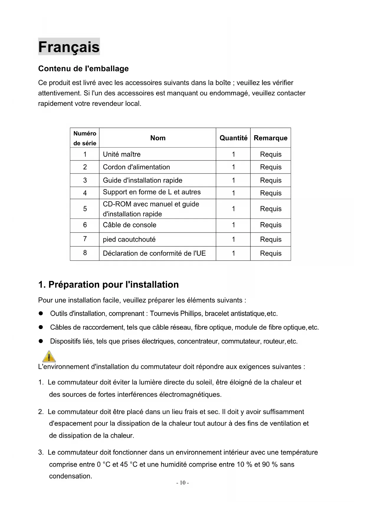 Pour une installation facile, veuillez préparer les éléments suivants : l Outils d'installation, comprenant : Tournevis Phillips, bracelet antistatique, etc. l Câbles de raccordement, tels que câble réseau, fibre optique, module de fibre optique, etc. l Dispositifs liés, tels que prises électriques, concentrateur, commutateur, routeur, etc. L'environnement d'installation du commutateur doit répondre aux exigences suivantes :