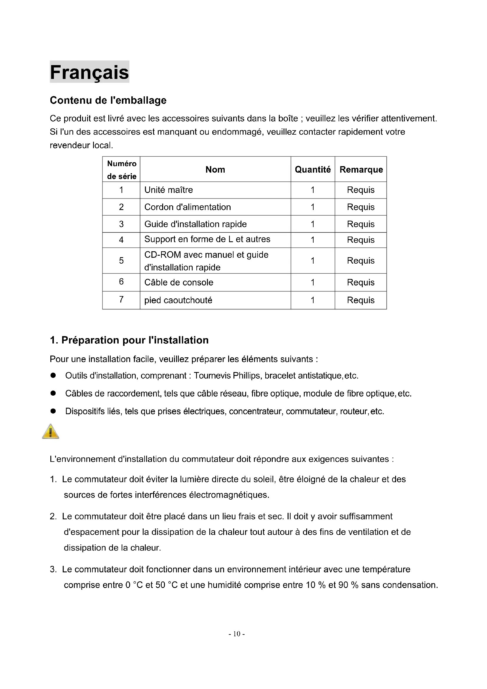 Pour une installation facile, veuillez préparer les éléments suivants : l Outils d'installation, comprenant : Tournevis Phillips, bracelet antistatique, etc. l Câbles de raccordement, tels que câble réseau, fibre optique, module de fibre optique, etc. l Dispositifs liés, tels que prises électriques, concentrateur, commutateur, routeur, etc. L'environnement d'installation du commutateur doit répondre aux exigences suivantes :