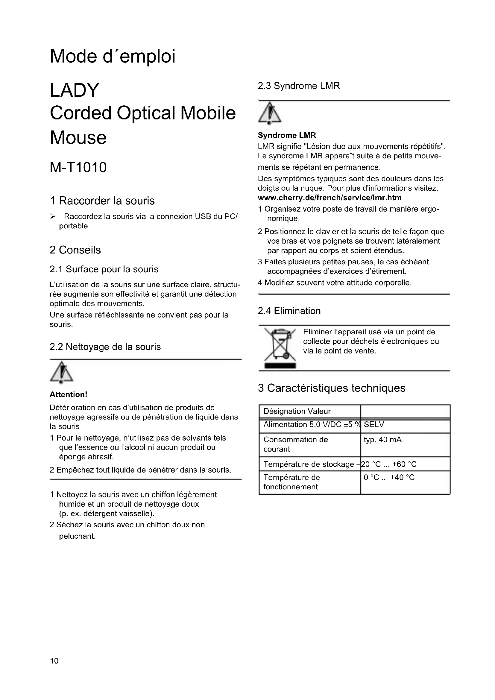 LADY MT1010 - Souris d'ordinateur Cherry - Notice d'utilisation et mode d'emploi gratuit