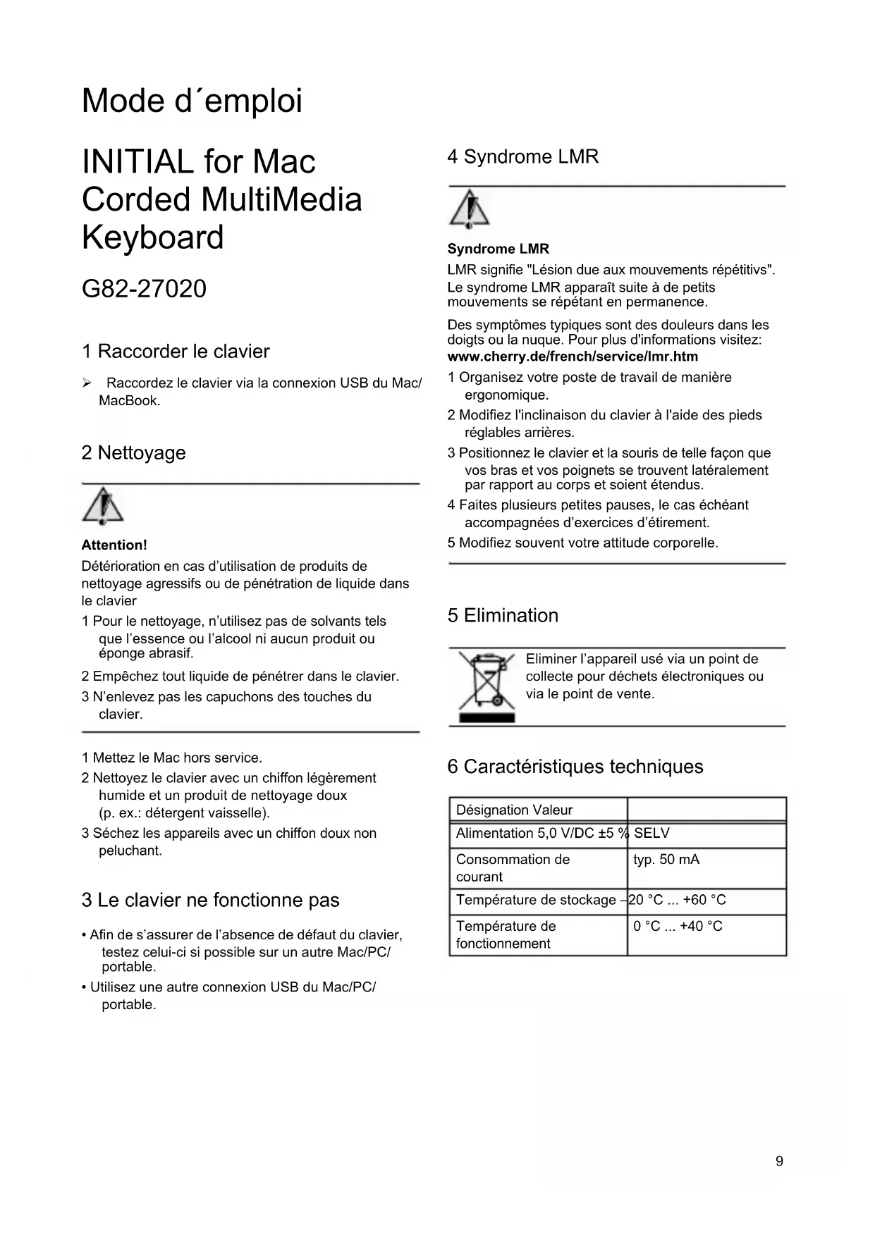 INITIAL for Mac Corded MultiMedia Keyboard G82-27020 1 Raccorder le clavier ¾ Raccordez le clavier via la connexion USB du Mac/ MacBook. 2 Nettoyage Attention! Détérioration en cas d’utilisation de produits de nettoyage agressifs ou de pénétration de liquide dans le clavier 1 Pour le nettoyage, n’utilisez pas de solvants tels que l’essence ou l’alcool ni aucun produit ou éponge abrasif. 2 Empêchez tout liquide de pénétrer dans le clavier. 3 N’enlevez pas les capuchons des touches du clavier. 1 Mettez le Mac hors service. 2 Nettoyez le clavier avec un chiffon légèrement humide et un produit de nettoyage doux (p. ex.: détergent vaisselle). 3 Séchez les appareils avec un chiffon doux non peluchant. 3 Le clavier ne fonctionne pas