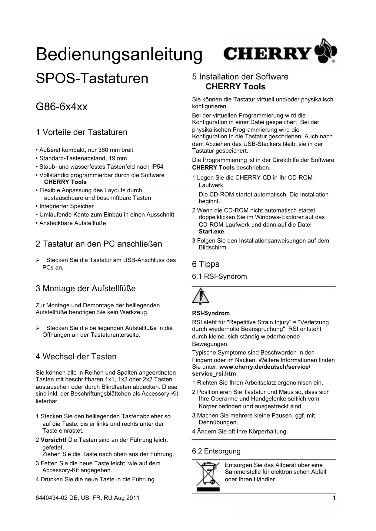 - Extrêmement compacts, seulement 360 mm de largeur• Ecart standard entre les touches, 19 mm• Claviers résistant à la poussière et aux projections de liquide, conformément à la norme IP54• Entièrement programmables avec le logiciel CHERRY Tools• Adaptation de l'agencement des touches en toute simplicité grâce aux touches amovibles et relégendables• Mémoire intégrée• Arête sur le pourtour, permettant l'insertion dans un logement• Pieds d'appui fixables 2 Raccorder le clavier Raccordez le clavier via la connexion USB du PC. 3 Montage des pieds d'appui Vous n'avez pas besoin d'outil pour monter et démonter les pieds d'appui fournis. Insérez les pieds dans les orifices aménagés sous le clavier. 4 Changement de touches Vous pouvez remplacer toutes les touches agencées en lignes et en colonnes par des touches relégendables 1x1, 1x2 ou 2x2 ou les recouvrir de touches "aveugles". Celles-ci sont disponibles en kit accessoires et fournies avec des étiquettes.1 Placez l'extracteur de touche (fourni) de telle manière qu'il s'enclenche à droite et à gauche, sous la touche.2 Attention! Le guide dans lequel est inséré la tou-che est légèrement lubrifié.Tirez la touche par le haut hors de son guide.3 Graissez légèrement la nouvelle touche comme indiqué dans le kit accessoires.4 Enfoncez la nouvelle touche dans le guide. 5 Installation du logiciel CHERRY Tools Vous pouvez configurer votre clavier de manière virtuelle et/ou physique.Lors de la programmation virtuelle, la configuration est enregistrée dans un fichier. Avec la programmation physique, la configuration est inscrite dans le clavier même. Elle reste enregistrée dans le clavier, même après retrait du connecteur USB.La programmation est décrite dans l'aide directe du logiciel CHERRY Tools.1 Placez le CD CHERRY dans votre lecteur de CD-ROM.Le CD-ROM démarre automatiquement. L’installation commence.2 Si le CD-ROM ne démarre pas automatiquement, faites un double clic sur le lecteur de CD-ROM dans l’Explorateur et ensuite sur le fichier de démarrage Start.exe.3 Suivez les instructions d’installation à l’écran. 6 Conseils