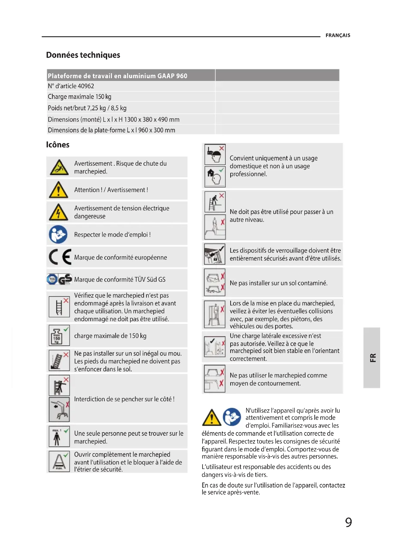 FRANÇAIS Icônes A l u m i n u m W e r k b a n k M L - 2 0 5 Avertissement . Risque de chute du marchepied. Attention ! / Avertissement ! Avertissement de tension électrique dangereuse Respecter le mode d‘emploi ! Marque de conformité européenne Marque de conformité TÜV Süd GS A l u minu m W e r k b ank M L - 205 Vériez que le marchepied n‘est pas endommagé après la livraison et avant chaque utilisation. Un marchepied endommagé ne doit pas être utilisé. A l u minu m W e r k b ank M L - 205 charge maximale de 150 kg A l u minu m W e r k b ank M L - 205 Ne pas installer sur un sol inégal ou mou. Les pieds du marchepied ne doivent pas s‘enfoncer dans le sol. A l u minu m W e r k b ank M L - 205 A lu mi nu m We rk ba nk M L- 20 5 Interdiction de se pencher sur le côté ! A l u minu m W e r k b ank M L - 205 Une seule personne peut se trouver sur le marchepied. A l u minu m W e r k b ank M L - 205 Ouvrir complètement le marchepied avant l‘utilisation et le bloquer à l‘aide de l‘étrier de sécurité. A l u minu m W e r k b ank M L - 205 A l u minu m W e r k b ank M L - 205 Convient uniquement à un usage domestique et non à un usage professionnel. A lu mi nu m We rk ba nk M L- 20 5 Ne doit pas être utilisé pour passer à un autre niveau. A lu mi nu m We rk ba nk M L- 20 5 Les dispositifs de verrouillage doivent être entièrement sécurisés avant d‘être utilisés. A lu mi nu m We rk ba nk M L- 20 5 Ne pas installer sur un sol contaminé. A lu mi nu m We rk ba nk M L- 20 5 Lors de la mise en place du marchepied, veillez à éviter les éventuelles collisions avec, par exemple, des piétons, des véhicules ou des portes. Al um in um W er kb an k ML -2 05 Une charge latérale excessive n‘est pas autorisée. Veillez à ce que le marchepied soit bien stable en l‘orientant correctement. A l u mi n um We rk b an k M L - 20 5 Ne pas utiliser le marchepied comme moyen de contournement. N‘utilisez l‘appareil qu‘après avoir lu attentivement et compris le mode d‘emploi. Familiarisez-vous avec les éléments de commande et l‘utilisation correcte de l‘appareil. Respectez toutes les consignes de sécurité gurant dans le mode d‘emploi. Comportez-vous de manière responsable vis-à-vis des autres personnes. L‘utilisateur est responsable des accidents ou des dangers vis-à-vis de tiers. En cas de doute sur l‘utilisation de l‘appareil, contactez le service après-vente. Données techniques Plateforme de travail en aluminium GAAP 960 N° d‘article 40962 Charge maximale 150 kg Poids net/brut 7,25 kg / 8,5 kg Dimensions (monté) L x l x H 1300 x 380 x 490 mm Dimensions de la plate-forme L x l 960 x 300 mm10