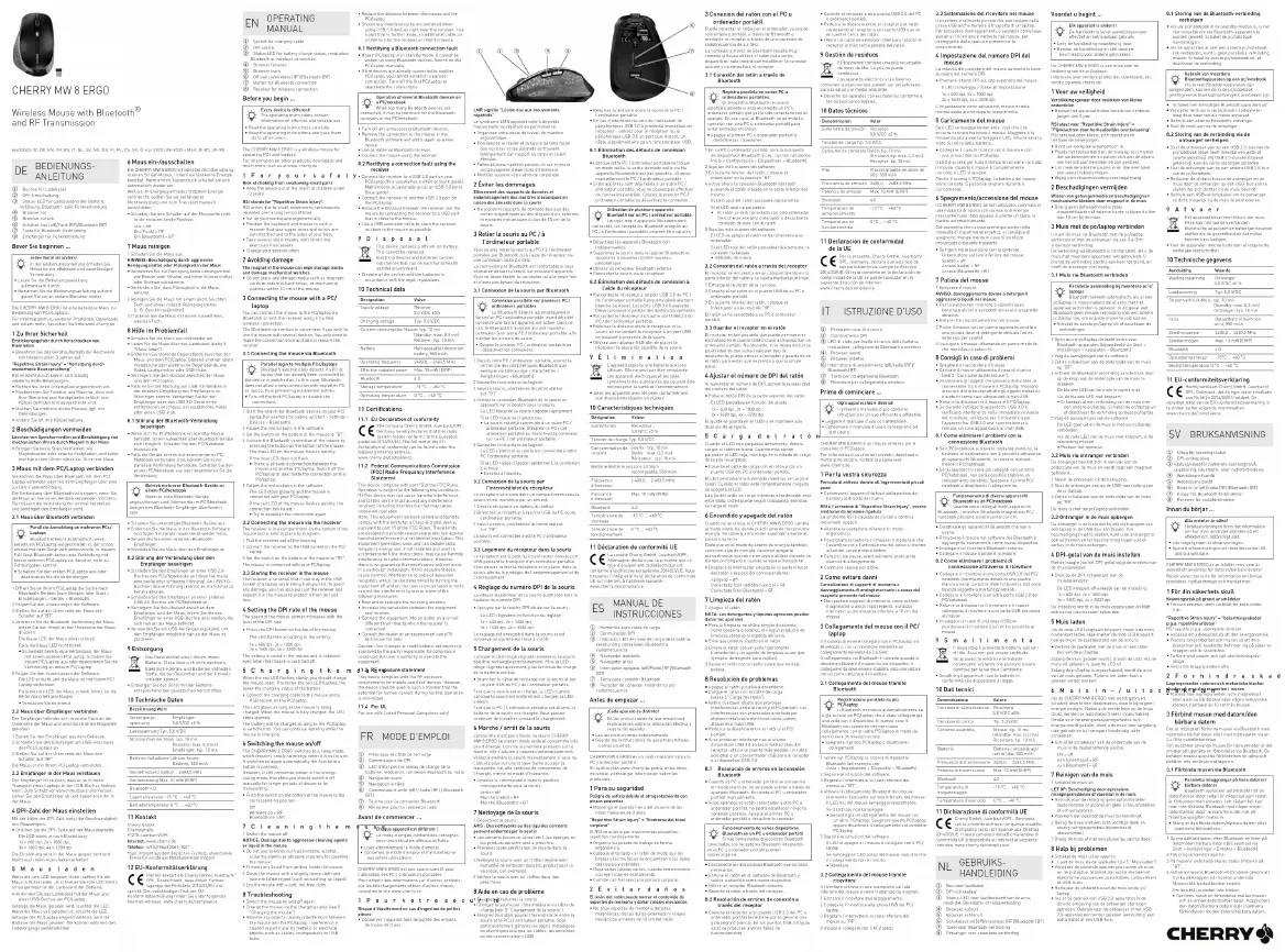 - Raccordez le récepteur à un port USB 2.0 du PC / de l’ordinateur portable (languette généralement blanche ou noire). Les ports USB 3.0 (languette bleue) produisent parfois des dysfonctionnements.• Raccordez le récepteur à un autre port USB 2.0 du PC / de l’ordinateur portable.• Réduisez la distance entre le récepteur et la souris en raccordant le récepteur à un port USB se trouvant à proximité de la souris.• Utilisez une rallonge USB afin de placer le récepteur le plus près possible de la souris. 9Élimination L’appareil exploite une batterie aux ions Lithium. Elle ne peut pas être remplacée.Les appareils électriques et les piles contiennent des substances qui peuvent être nocives pour la santé et l'environnement.• Jetez les appareils avec les piles conformément aux dispositions légales en vigueur. 10 Caractéristiques techniques 11 Déclaration de conformité UE La société Cherry GmbH, Auerbach/OPf., Allemagne, déclare par la présente que ce type d’équipement radioélectrique est conforme à la directive européenne 2014/53/UE. Vous trouverez l’intégralité de la déclaration de conformité UE sur Internet, à l'adresse suivante : www.cherry.de/compliance.① Hembrilla para cable de carga② Conmutación DPI③ Indicador LED del nivel de carga de la batería, resolución y conexiones Bluetooth o radiofrecuencia④ Navegador adelante⑤ Navegador atrás⑥ Interruptor apagado (off)/Radio (RF)/Bluetooth (BT) ⑦ Tecla para conexión Bluetooth⑧ Receptor de conexión inalámbrica por radiofrecuencia Antes de empezar ... CHERRY MW 8 ERGO es un ratón inalámbrico para PC y ordenador portátil.En la dirección www.cherry.de podrá, entre otros, encontrar y descargar información sobre los productos. 1 Para su seguridad Peligro de asfixia debido al atragantamiento con piezas pequeñas• Mantenga el aparato fuera del alcance de los niños menores de 3 años."Repetitive Strain Injury" = "Síndrome del túnel carpiano"El RSI se origina por movimientos pequeños, repetidos continuamente.• Organice su puesto de trabajo de forma ergonómica.• Coloque el teclado y el ratón de modo que los brazos y las muñecas se encuentren a los lados del cuerpo y estirados.• Haga varias pausas cortas, cuando sea necesario con ejercicios de estiramiento.• Cambie con frecuencia la postura corporal. 2Evitar daños El imán del ratón puede borrar el contenido de soportes de memoria y dañar relojes mecánicos• No sitúe soportes de memoria (tarjetas magnéticas, discos duros externos) ni relojes mecánicos a menos de 10 cm del ratón.Utilisation de plusieurs appareils Bluetooth sur un PC / ordinateur portableLorsque trop d’appareils Bluetooth sont connectés, les récepteurs Bluetooth intégrés au PC / à l’ordinateur portables peuvent être saturés.Désignation Valeur Alimentation Récepteur : 5,0 V/CC ±5 %Tension de charge Typ. 5,0 V/CCConsommation de courantSouris : typ. 10 mA (Veille : max. 0,3 mA) Récepteur : typ. 10 mABatterie Batterie aux ions Lithium rechargeable, 550 mAhFréquence d’émission 2 400,0 ... 2 483,5 MHz Puissance d’émissionMax. 10 mW (PIRE)Bluetooth 4.0Température de stockage-15 °C ... +60 °CTempérature de fonctionnement0 °C ... +40 °C