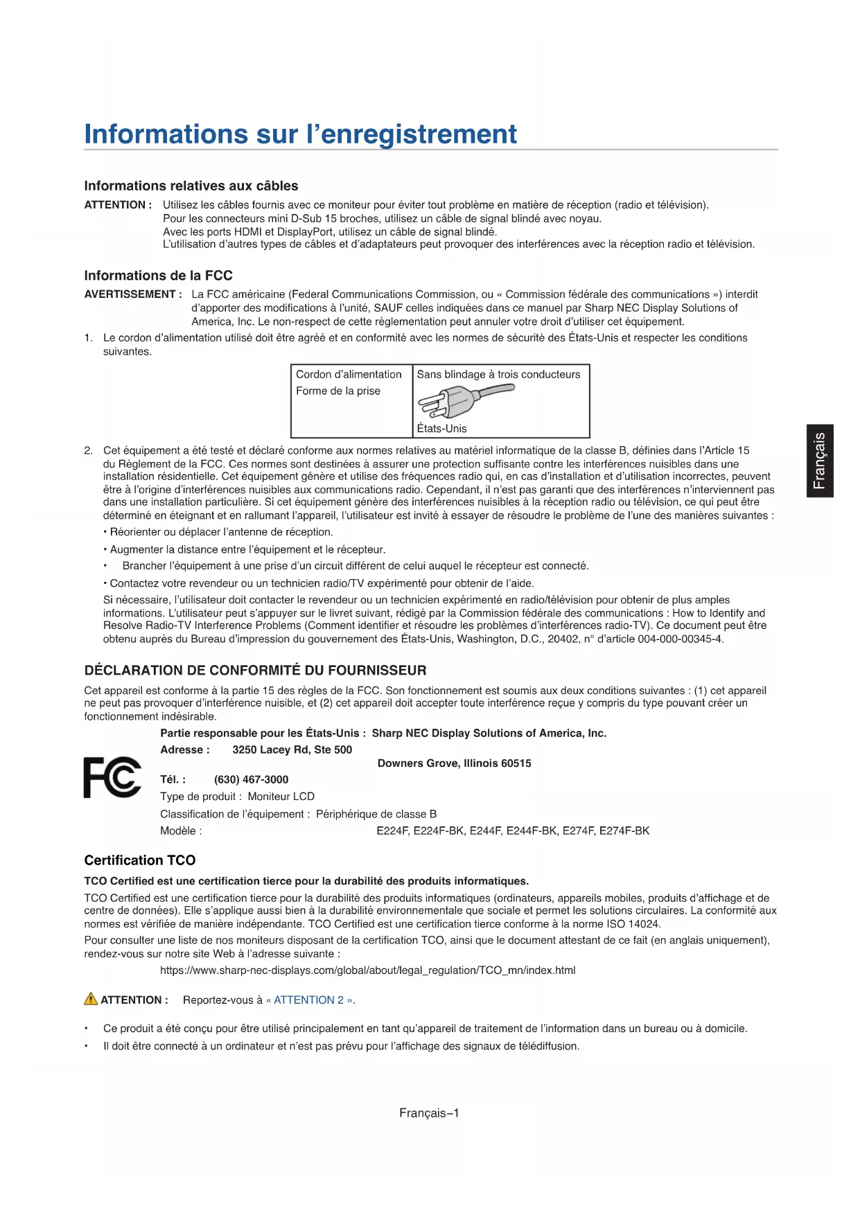 TCO Certied est une certication tierce pour la durabilité des produits informatiques (ordinateurs, appareils mobiles, produits d’afchage et de centre de données). Elle s’applique aussi bien à la durabilité environnementale que sociale et permet les solutions circulaires. La conformité aux normes est vériée de manière indépendante. TCO Certied est une certication tierce conforme à la norme ISO 14024. Pour consulter une liste de nos moniteurs disposant de la certication TCO, ainsi que le document attestant de ce fait (en anglais uniquement), rendez-vous sur notre site Web à l’adresse suivante : https://www.sharp-nec-displays.com/global/about/legal_regulation/TCO_mn/index.html Reportez-vous à « ATTENTION 2 ».