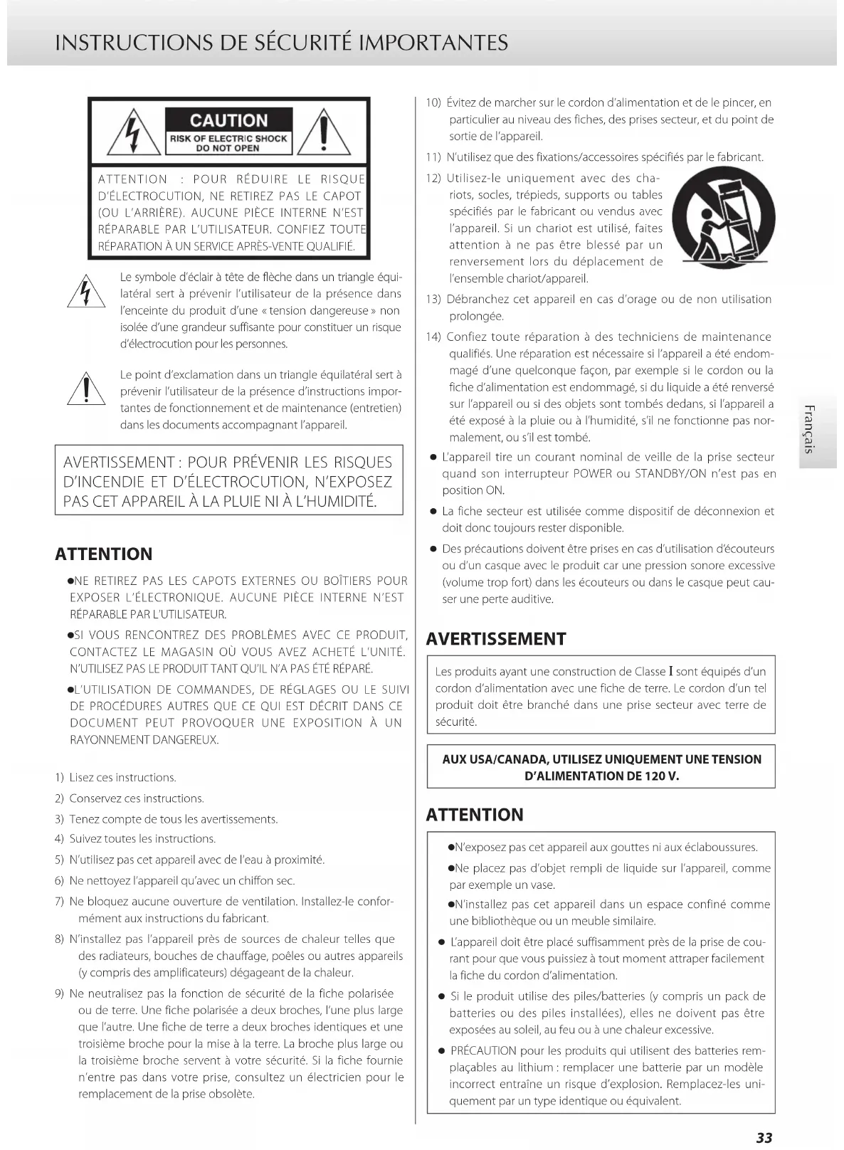 D’INCENDIE ET D’ÉLECTROCUTION, N’EXPOSEZ PAS CET APPAREIL À LA PLUIE NI À L’HUMIDITÉ. ATTENTION o NE RETIREZ PAS LES CAPOTS EXTERNES OU BOÎTIERS POUR EXPOSER L’ÉLECTRONIQUE. AUCUNE PIÈCE INTERNE N’EST RÉPARABLE PAR L’UTILISATEUR. o SI VOUS RENCONTREZ DES PROBLÈMES AVEC CE PRODUIT, CONTACTEZ LE MAGASIN OÙ VOUS AVEZ ACHETÉ L’UNITÉ. N’UTILISEZ PAS LE PRODUIT TANT QU’IL N’A PAS ÉTÉ RÉPARÉ. o L’UTILISATION DE COMMANDES, DE RÉGLAGES OU LE SUIVI DE PROCÉDURES AUTRES QUE CE QUI EST DÉCRIT DANS CE DOCUMENT PEUT PROVOQUER UNE EXPOSITION À UN RAYONNEMENT DANGEREUX.1) Lisez ces instructions.2) Conservez ces instructions.3) Tenez compte de tous les avertissements.4) Suivez toutes les instructions.5) N’utilisez pas cet appareil avec de l’eau à proximité.6) Ne nettoyez l’appareil qu’avec un chiffon sec.7) Ne bloquez aucune ouverture de ventilation. Installez-le confor-mément aux instructions du fabricant.8) N’installez pas l’appareil près de sources de chaleur telles que des radiateurs, bouches de chauffage, poêles ou autres appareils (y compris des amplificateurs) dégageant de la chaleur.9) Ne neutralisez pas la fonction de sécurité de la fiche polarisée ou de terre. Une fiche polarisée a deux broches, l’une plus large que l’autre. Une fiche de terre a deux broches identiques et une troisième broche pour la mise à la terre. La broche plus large ou la troisième broche servent à votre sécurité. Si la fiche fournie n’entre pas dans votre prise, consultez un électricien pour le remplacement de la prise obsolète.10) Évitez de marcher sur le cordon d’alimentation et de le pincer, en particulier au niveau des fiches, des prises secteur, et du point de sortie de l’appareil.11) N’utilisez que des fixations/accessoires spécifiés par le fabricant.12) Utilisez-le uniquement avec des cha-riots, socles, trépieds, supports ou tables spécifiés par le fabricant ou vendus avec l’appareil. Si un chariot est utilisé, faites attention à ne pas être blessé par un renversement lors du déplacement de l’ensemble chariot/appareil.13) Débranchez cet appareil en cas d’orage ou de non utilisation prolongée.14) Confiez toute réparation à des techniciens de maintenance qualifiés. Une réparation est nécessaire si l’appareil a été endom-magé d’une quelconque façon, par exemple si le cordon ou la fiche d’alimentation est endommagé, si du liquide a été renversé sur l’appareil ou si des objets sont tombés dedans, si l’appareil a été exposé à la pluie ou à l’humidité, s’il ne fonctionne pas nor-malement, ou s’il est tombé. o L’appareil tire un courant nominal de veille de la prise secteur quand son interrupteur POWER ou STANDBY/ON n’est pas en position ON. o La fiche secteur est utilisée comme dispositif de déconnexion et doit donc toujours rester disponible. o Des précautions doivent être prises en cas d’utilisation d’écouteurs ou d’un casque avec le produit car une pression sonore excessive (volume trop fort) dans les écouteurs ou dans le casque peut cau-ser une perte auditive. AVERTISSEMENT Les produits ayant une construction de Classe ! sont équipés d’un cordon d’alimentation avec une fiche de terre. Le cordon d’un tel produit doit être branché dans une prise secteur avec terre de sécurité.AUX USA/CANADA, UTILISEZ UNIQUEMENT UNE TENSION D’ALIMENTATION DE 120V. ATTENTION o N’exposez pas cet appareil aux gouttes ni aux éclaboussures. o Ne placez pas d’objet rempli de liquide sur l’appareil, comme par exemple un vase. o N’installez pas cet appareil dans un espace confiné comme une bibliothèque ou un meuble similaire. o L’appareil doit être placé suffisamment près de la prise de cou- rant pour que vous puissiez à tout moment attraper facilement la fiche du cordon d’alimentation. o Si le produit utilise des piles/batteries (y compris un pack de batteries ou des piles installées), elles ne doivent pas être exposées au soleil, au feu ou à une chaleur excessive. o PRÉCAUTION pour les produits qui utilisent des batteries rem- plaçables au lithium: remplacer une batterie par un modèle incorrect entraîne un risque d’explosion. Remplacez-les uni-quement par un type identique ou équivalent.34 INSTRUCTIONS DE SÉCURITÉ IMPORTANTES (suite) V Précautions concernant les piles Un mauvais emploi des piles peut entraîner leur rupture ou leur fuite, avec pour conséquence un incendie, des blessures ou la salissure des objets proches. Veuillez lire et suivre attentivement les précautions suivantes. o Veillez à insérer les piles avec leurs pôles positif (¥) et négatif (^) correctement orientés. o Utilisez des piles du même type. N’utilisez jamais des types de pile différents ensemble. o Si la télécommande doit rester inutilisée durant une période pro- longée (plus d’un mois), retirez ses piles pour éviter qu’elles ne coulent. o Si les piles coulent, essuyez le liquide dans le compartiment des piles et remplacez les piles par des neuves. o N’utilisez pas de piles d’un type autre que celui spécifié. Ne mélan- gez pas des piles neuves avec des anciennes et n’utilisez pas ensemble des types de pile différents. o Ne chauffez pas et ne démontez pas les piles. Ne jetez jamais les piles dans un feu ou dans de l’eau. o Ne conservez et ne transportez pas les piles avec d’autres objets métalliques. Les piles pourraient entrer en court-circuit, couler ou exploser. o Ne rechargez jamais une batterie sans avoir vérifié qu’elle peut l’être. o N’exposez pas les piles à une pression d’air extrêmement basse car cela pourrait entraîner une explosion ou une fuite de liquides ou de gaz inflammables. Informations sur le laser Ce produit laser est un produit laser grand public selon la norme EN50689:2021 et est conforme à toutes les exigences relatives aux produits laser grand public, hors produits attrayants pour les enfants.