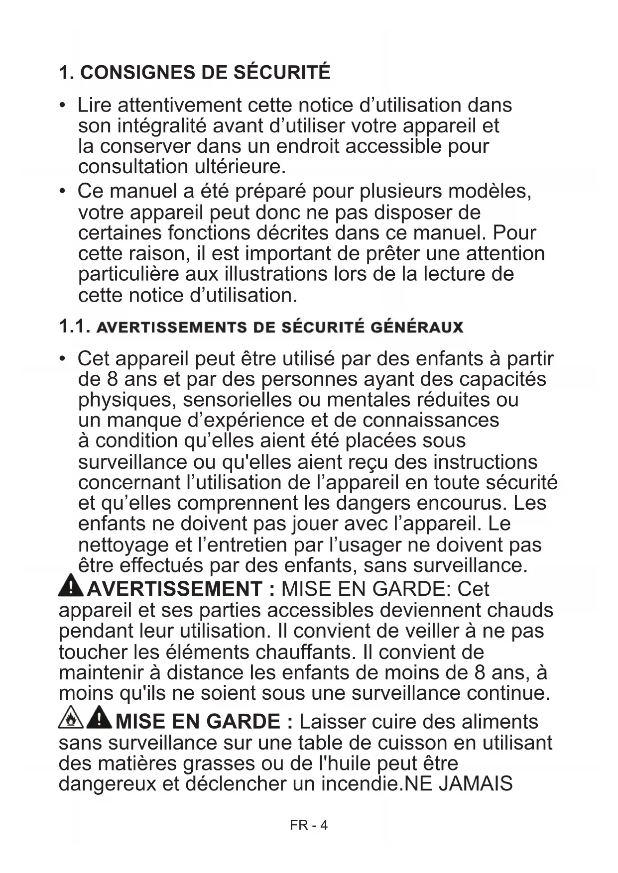 - MISE EN GARDE : La température des surfaces accessibles peut être élevée lorsque l'appareil est en fonctionnement. MISE EN GARDE : Laisser cuire des aliments sans surveillance sur une table de cuisson en utilisant des matières grasses ou de l'huile peut être dangereux et déclencher un incendie.FR - 10 NE JAMAIS essayer d'éteindre un incendie avec de l'eau, mais arrêter l'appareil puis couvrir les flammes par exemple avec un couvercle ou une couverture anti-feu.