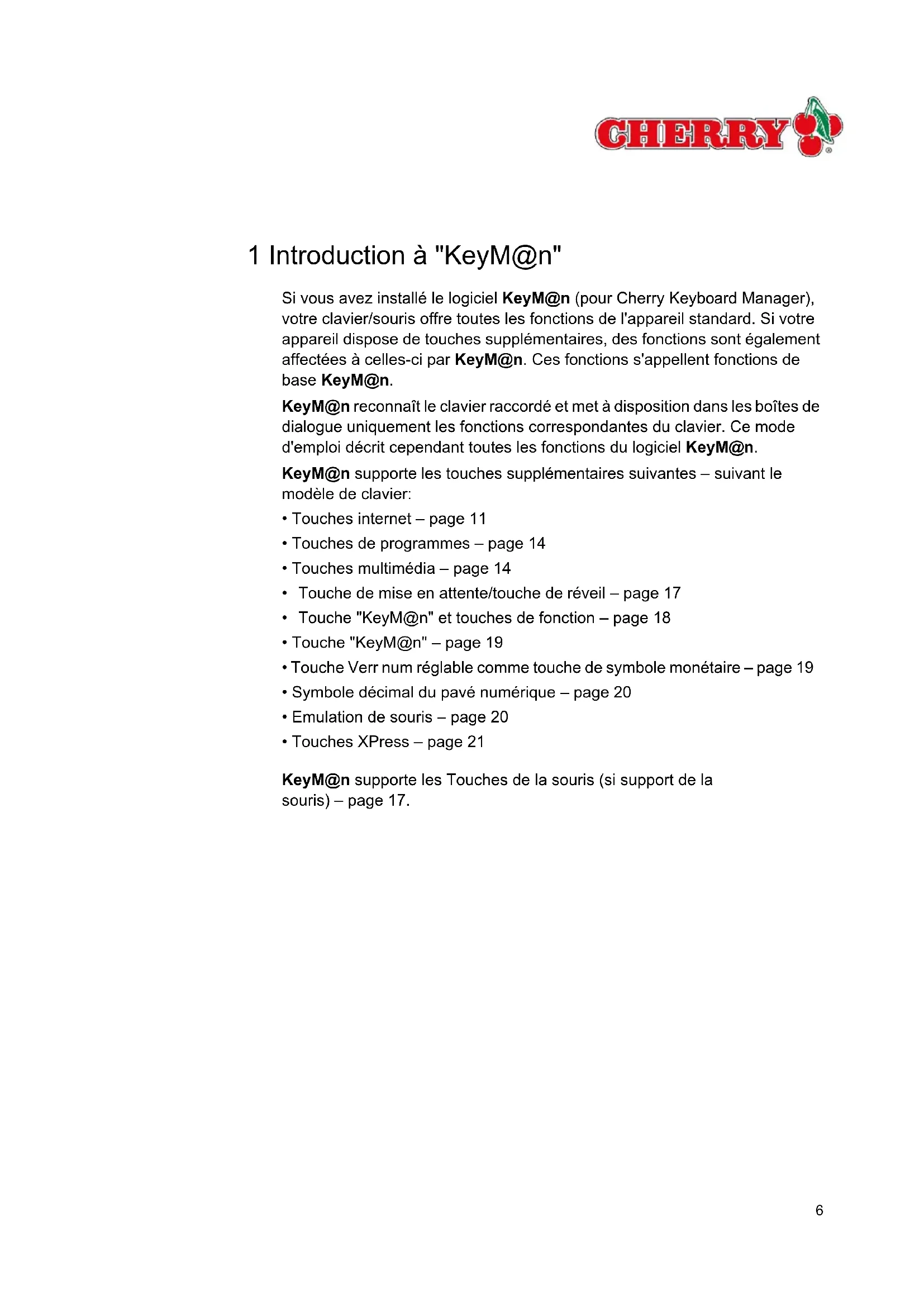 8.7 La souris PS/2 ne fonctionne pas ............................................................................................ 90 8.8 La roulette de la souris CyMotion ne fonctionne pas ............................................................... 906 1 Introduction à "KeyM@n" Si vous avez installé le logiciel KeyM@n (pour Cherry Keyboard Manager), votre clavier/souris offre toutes les fonctions de l'appareil standard. Si votre appareil dispose de touches supplémentaires, des fonctions sont également affectées à celles-ci par KeyM@n. Ces fonctions s'appellent fonctions de base KeyM@n. KeyM@n reconnaît le clavier raccordé et met à disposition dans les boîtes de dialogue uniquement les fonctions correspondantes du clavier. Ce mode d'emploi décrit cependant toutes les fonctions du logiciel KeyM@n. KeyM@n supporte les touches supplémentaires suivantes – suivant le modèle de clavier: