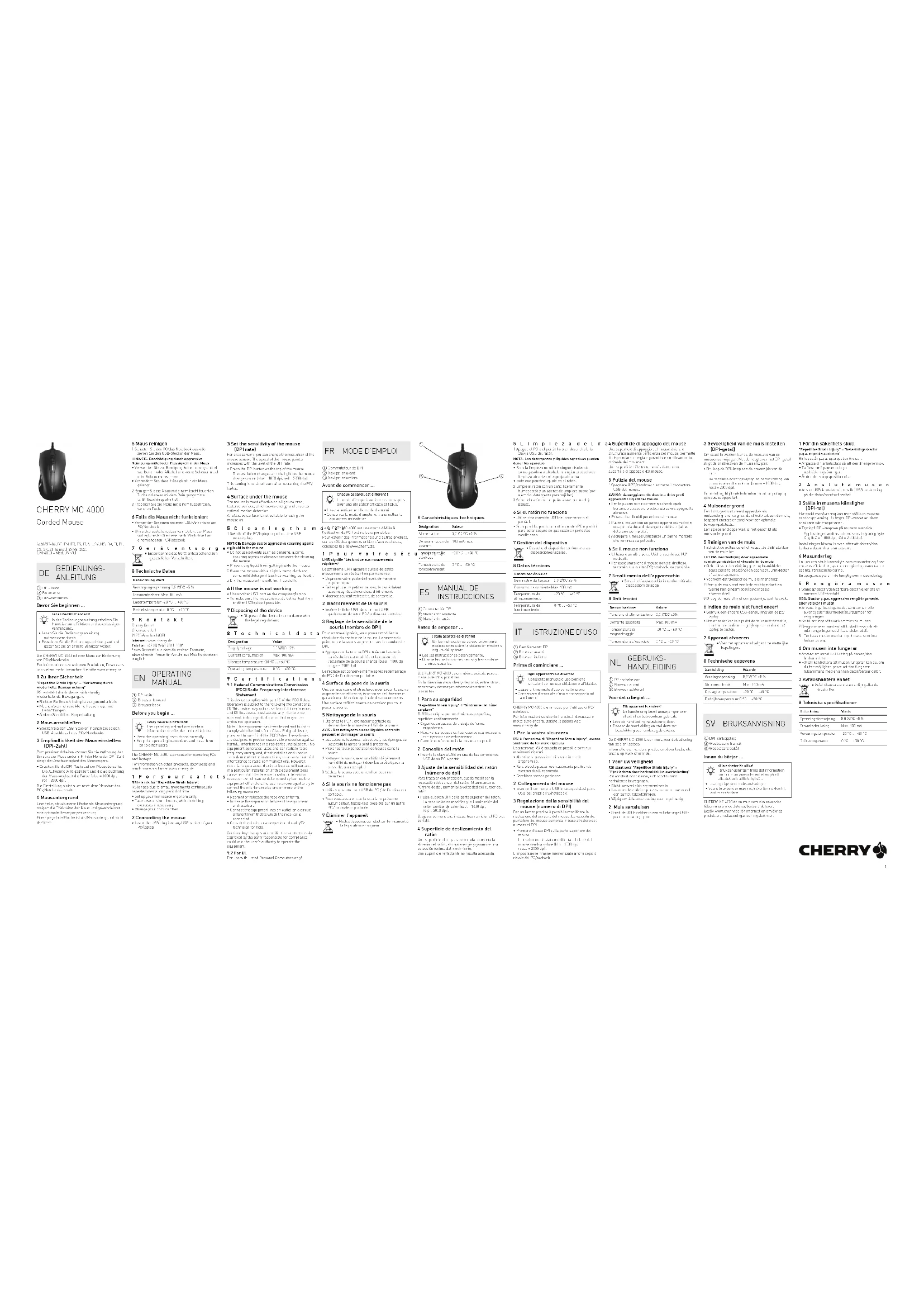 For use with Listed Personal Computers only! Designation Value Supply voltage 5.0 V/DC ±5% Current consumption Max. 100 mA Storage temperature -20 °C ... +60 °C Operating temperature 0 °C ... +50 °C ① Commutateur de DPI ② Navigation avant ③ Navigation arrière Avant de commencer ... Le CHERRY MC 4000 est une souris dédiée à l’utilisation de PC / ordinateurs portables. Pour obtenir des informations sur d'autres produits, sur les téléchargements et bien d'autres choses, consultez le site www.cherry.de. 1Pour votre sécurité LMR signifie "Lésion due aux mouvements répétitifs" Le syndrome LMR apparaît suite à de petits mouvements se répétant en permanence.