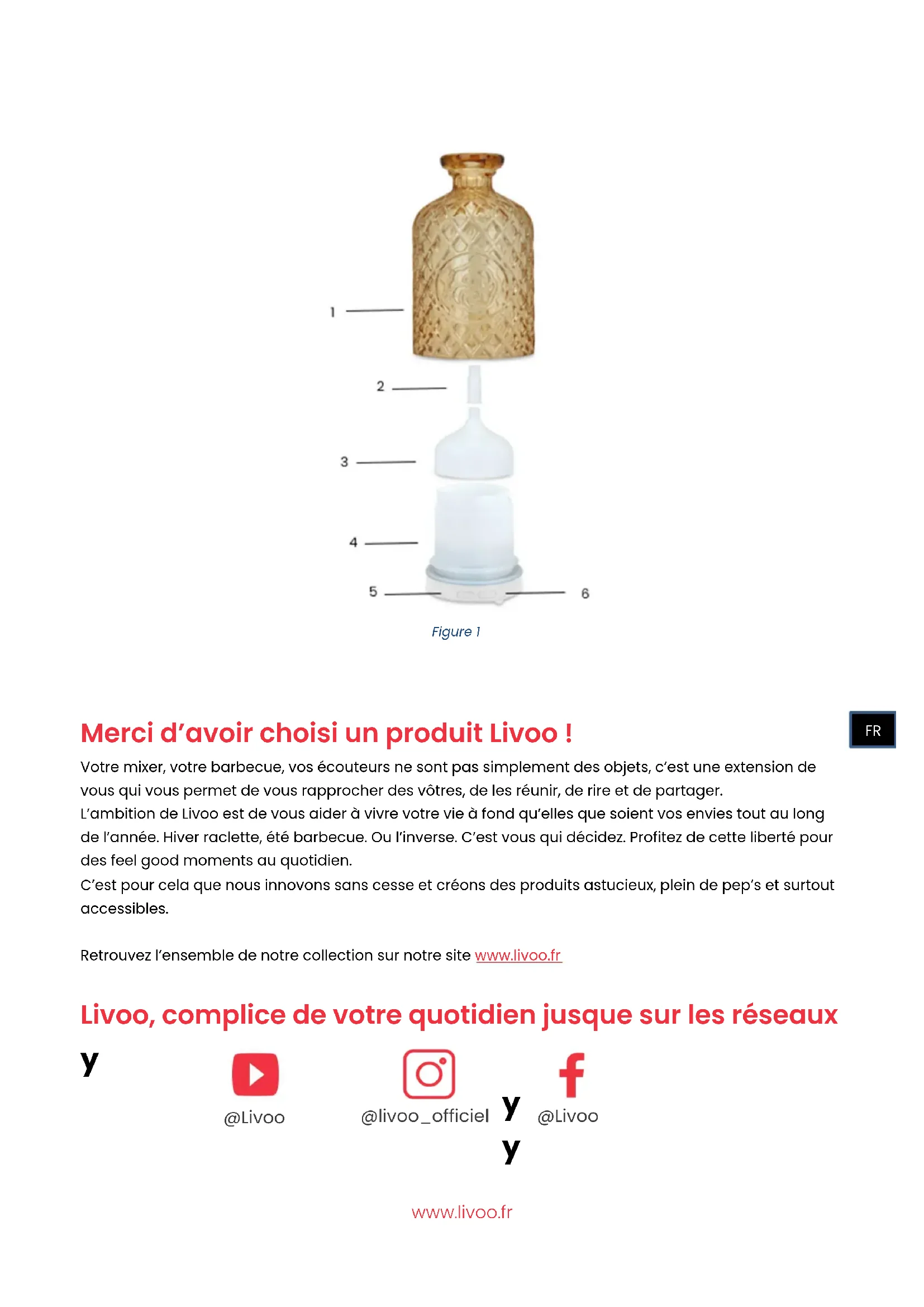 Merci d’avoir choisi un produit Livoo ! Votre mixer, votre barbecue, vos écouteurs ne sont pas simplement des objets, c’est une extension de vous qui vous permet de vous rapprocher des vôtres, de les réunir, de rire et de partager. L’ambition de Livoo est de vous aider à vivre votre vie à fond qu’elles que soient vos envies tout au long de l’année. Hiver raclette, été barbecue. Ou l’inverse. C’est vous qui décidez. Profitez de cette liberté pour des feel good moments au quotidien. C’est pour cela que nous innovons sans cesse et créons des produits astucieux, plein de pep’s et surtout accessibles. Retrouvez l’ensemble de notre collection sur notre site www.livoo.fr Livoo, complice de votre quotidien jusque sur les réseaux