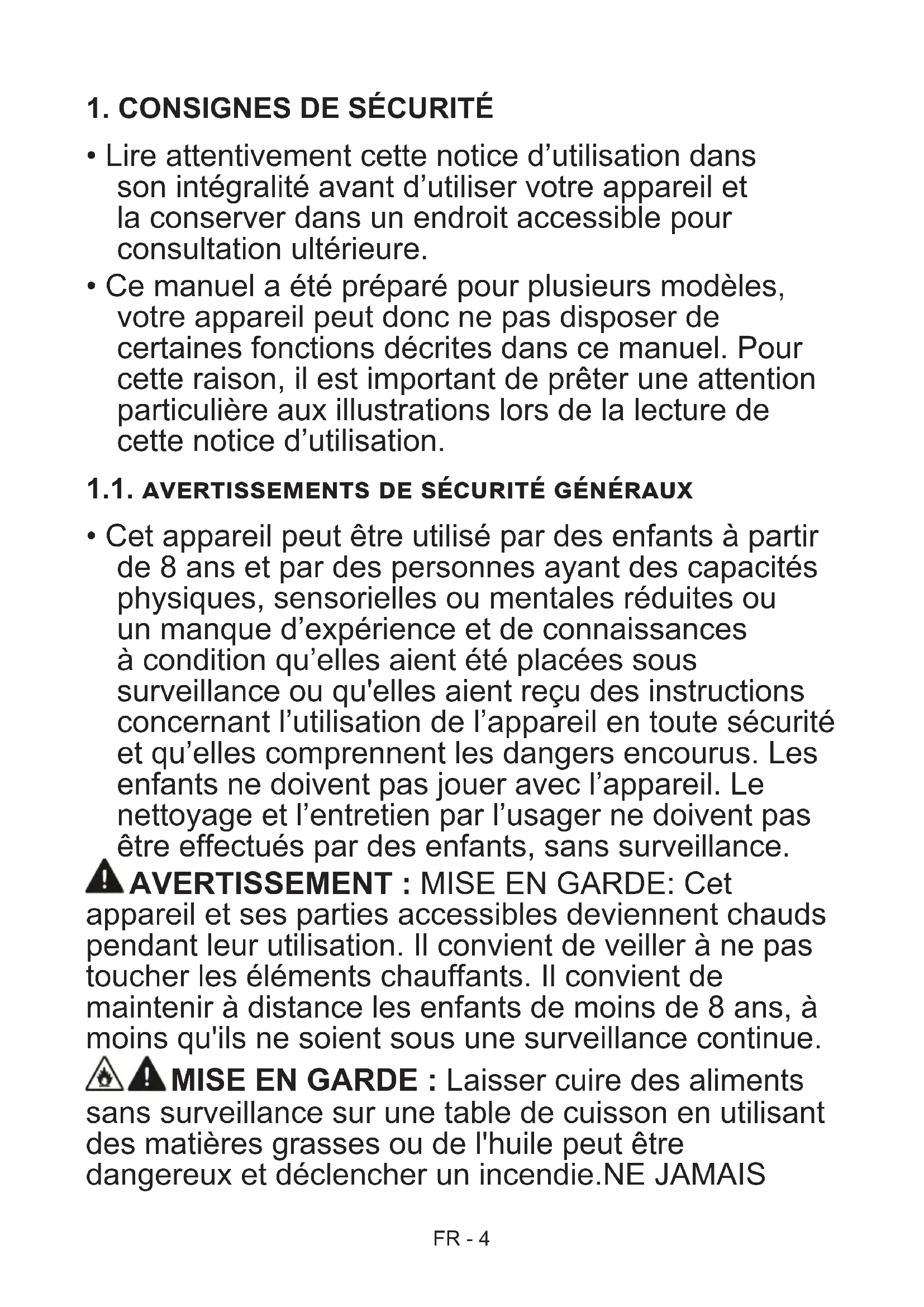 - MISE EN GARDE : Utiliser uniquement les dispositifs de protection de table de cuisson conçus par le fabricant de l’appareil de cuisson ou indiqués par le fabricant de l’appareil dans les instructions d’utilisation comme adaptés ou les dispositifs de protection de table de cuisson intégrés à l’appareil. L’utilisation de dispositifs de protection nonFR - 10 appropriés peut entrainer des accidents.